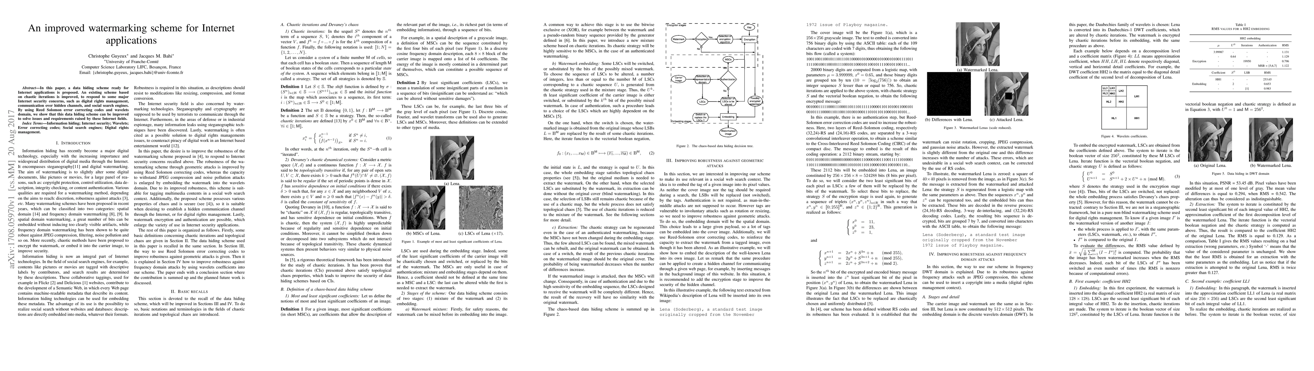 In this paper, a data hiding scheme ready for Internet applications is proposed. An existing scheme based on chaotic iterations is improved, to respond to some major Internet security concerns, such as digital rights management, communication over hidden channels, and social search engines. By using Reed Solomon error correcting codes and wavelets domain, we show that this data hiding scheme can be improved to solve issues and requirements raised by these Internet fields.