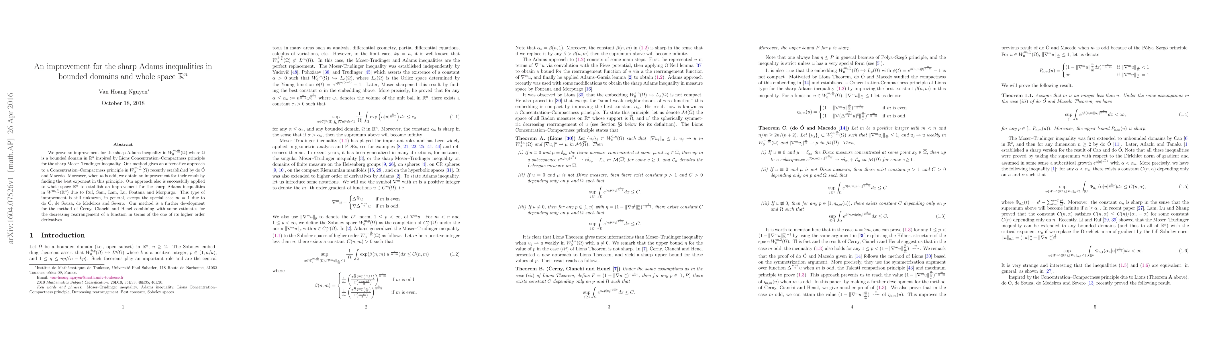 We prove an improvement for the sharp Adams inequality in $W^{m,\frac nm}_0(\Omega)$ where $\Omega$ is a bounded domain in $\mathbb{R}^n$ inspired by Lions Concentration--Compactness principle for the sharp Moser--Trudinger inequality. Our method gives an alternative approach to a Concentration--Compactness principle in $W^{m,\frac nm}_0(\Omega)$ recently established by do \'O and Macedo. Moreover, when $m$ is odd, we obtain an improvement for their result by finding the best exponent in this principle. Our approach also is successfully applied to whole space $\mathbb{R}^n$ to establish an improvement for the sharp Adams inequalities in $W^{m,\frac nm}(\mathbb{R}^n)$ due to Ruf, Sani, Lam, Lu, Fontana and Morpurgo. This type of improvement is still unknown, in general, except the special case $m=1$ due to do \'O, de Souza, de Medeiros and Severo. Our method is a further development for the method of $\check{\rm C}$erny, Cianchi and Hencl combining with some estimates for the decreasing rearrangement of a function in terms of the one of its higher order derivatives.