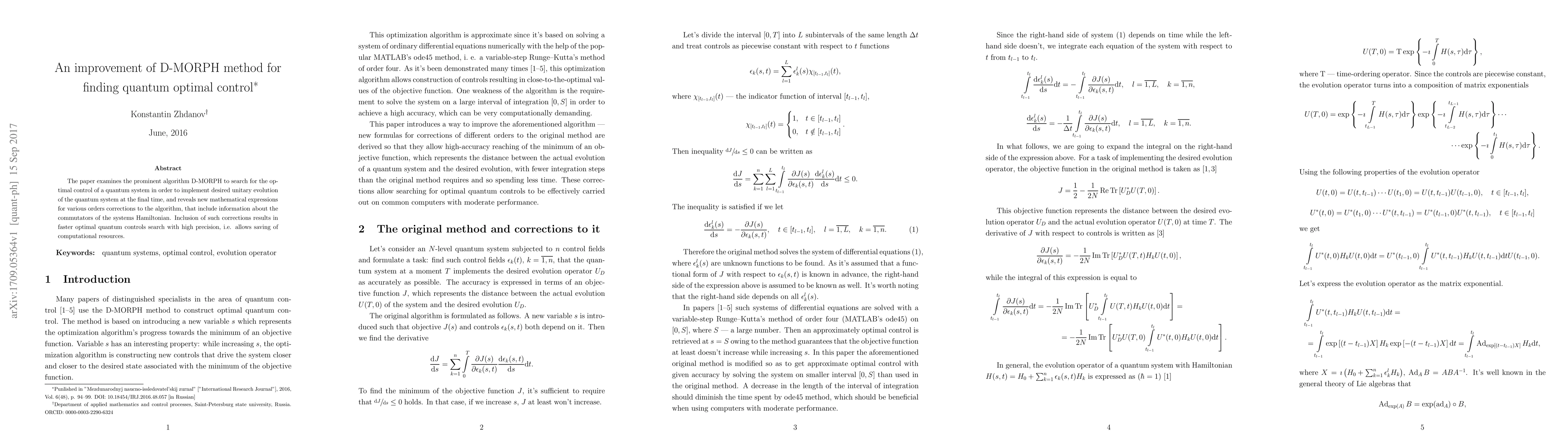 The paper examines the prominent algorithm D-MORPH to search for the optimal control of a quantum system in order to implement desired unitary evolution of the quantum system at the final time, and reveals new mathematical expressions for various orders' corrections to the algorithm, that include information about the commutators of the system's Hamiltonian. Inclusion of such corrections results in faster optimal quantum control's search with high precision, i.e. allows saving of computational resources.