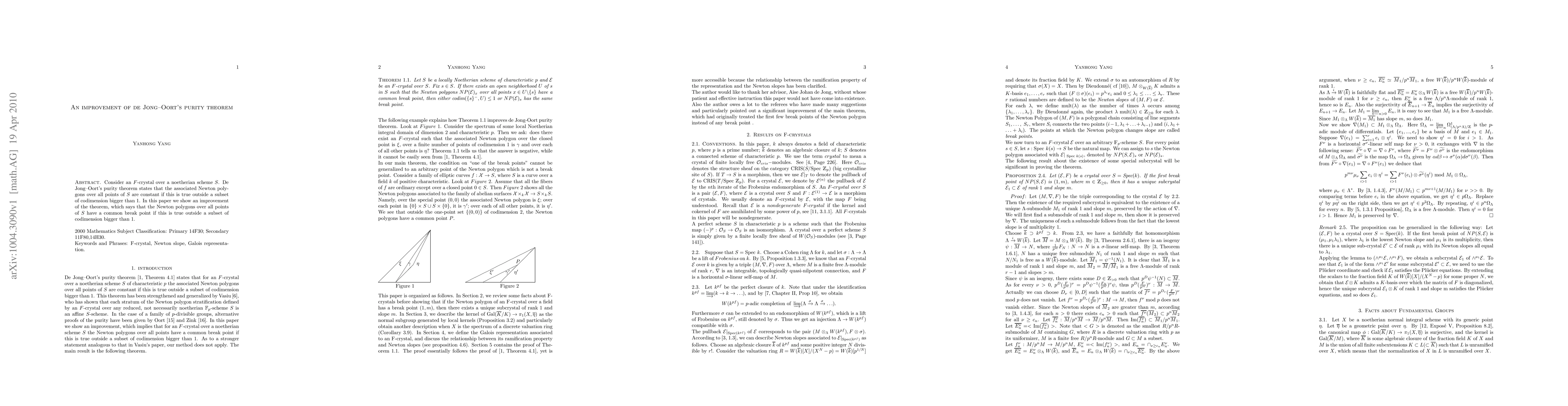 Consider an $F$-crystal over a noetherian scheme $S$. De Jong--Oort's purity theorem states that the associated Newton polygons over all points of $S$ are constant if this is true outside a subset of codimension bigger than 1. In this paper we show an improvement of the theorem, which says that the Newton polygons over all points of $S$ have a common break point if this is true outside a subset of codimension bigger than 1.