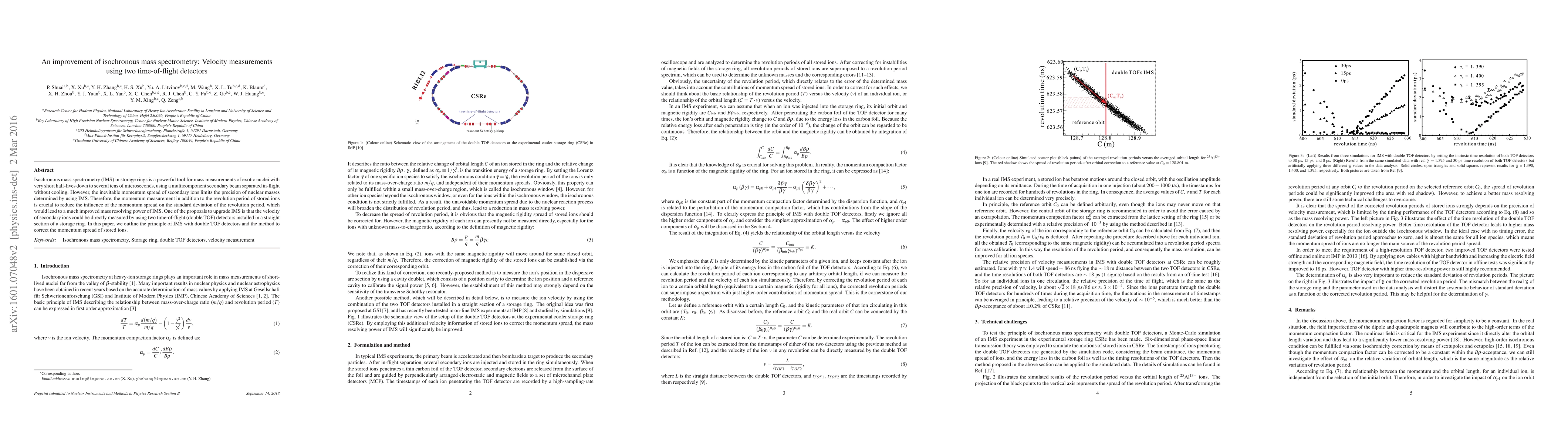 This paper proposes an enhancement to isochronous mass spectrometry (IMS) using two time-of-flight detectors to directly measure the velocity of secondary ions, aiming to improve mass resolving power by correcting the momentum spread of ions. The method seeks to increase precision in mass measurements of short-lived exotic nuclei.