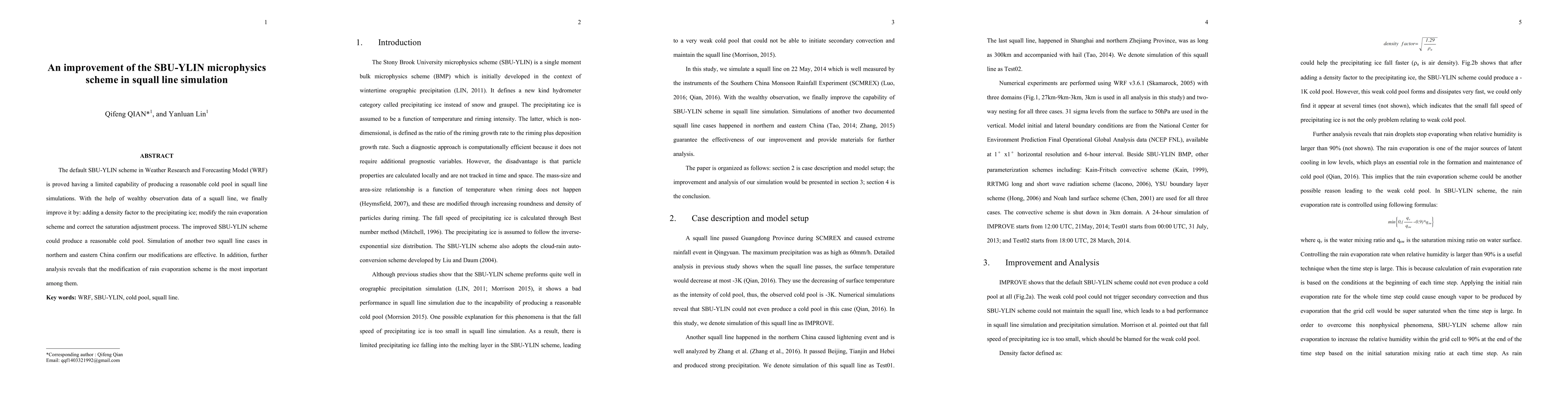 The research improved the SBU-YLIN microphysics scheme in squall line simulation through adding a density factor to precipitating ice, modifying the rain evaporation scheme, and correcting the saturation adjustment process.
