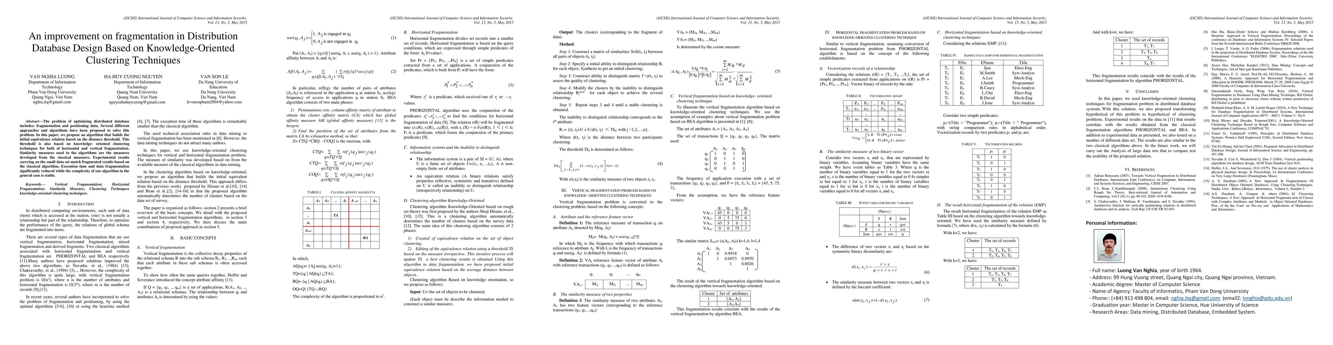 The problem of optimizing distributed database includes: fragmentation and positioning data. Several different approaches and algorithms have been proposed to solve this problem. In this paper, we propose an algorithm that builds the initial equivalence relation based on the distance threshold. This threshold is also based on knowledge- oriented clustering techniques for both of horizontal and vertical fragmentation. Similarity measures used in the algorithms are the measures developed from the classical measures. Experimental results carrying on the small data set match fragmented results based on the classical algorithm. Execution time and data fragmentation significantly reduced while the complexity of our algorithm in the general case is stable.
