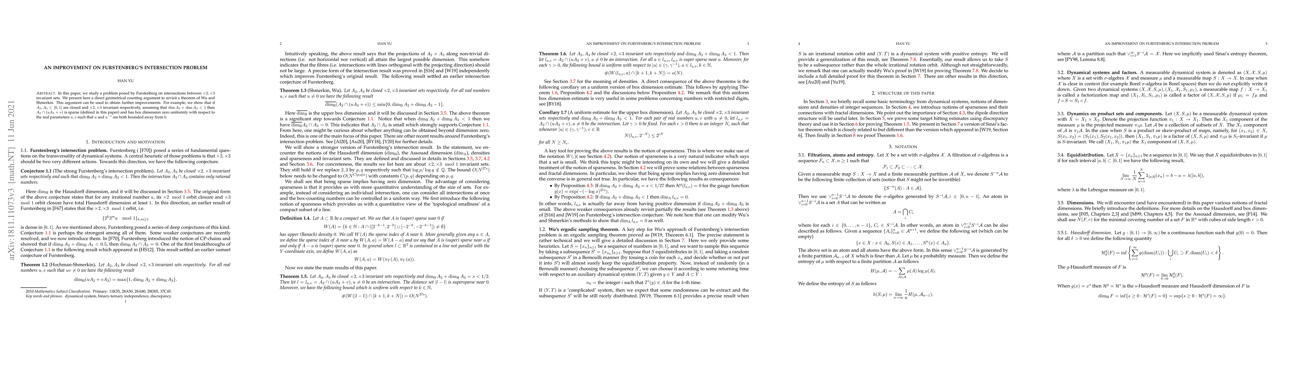 In this paper, we study a problem posed by Furstenberg on intersections between $\times 2, \times 3$ invariant sets. We present here a direct geometrical counting argument to revisit a theorem of Wu and Shmerkin. This argument can be used to obtain further improvements. For example, we show that if $A_2,A_3\subset [0,1]$ are closed and $\times 2, \times 3$ invariant respectively, assuming that $\dim A_2+\dim A_3<1$ then $A_2\cap (uA_3+v)$ is sparse (defined in this paper) and has box dimension zero uniformly with respect to the real parameters $u,v$ such that $u$ and $u^{-1}$ are both bounded away from $0$.