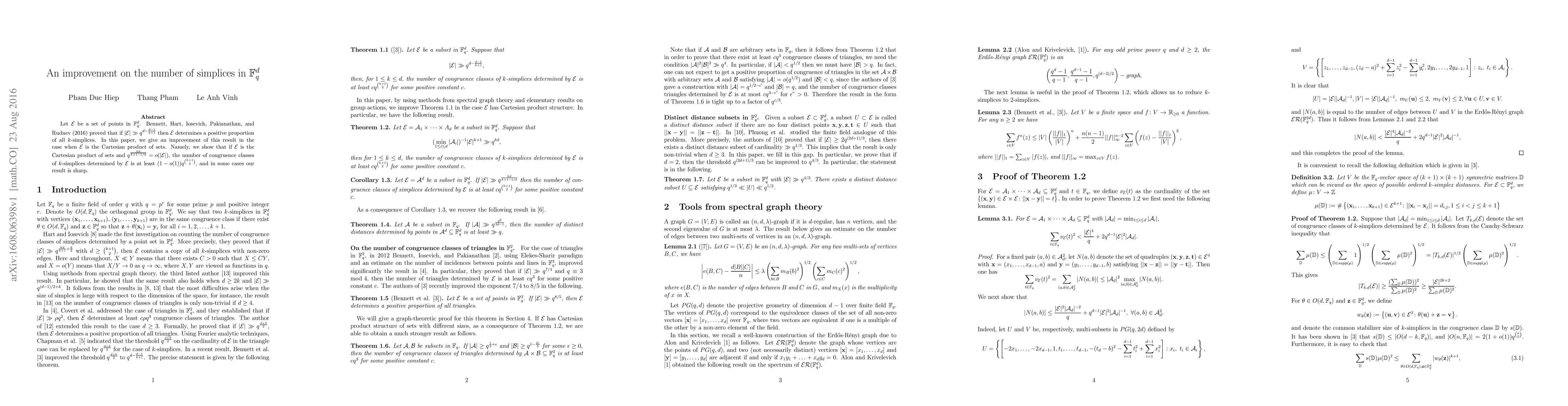 This paper improves upon the result by Bennett et al. (2016) regarding the number of simplices determined by a set of points in $\mathbb{F}_q^d$. Specifically, it shows that when $\mathcal{E}$ is the Cartesian product of sets, the number of congruence classes of $k$-simplices determined by $\mathcal{E}$ is at least $(1-o(1))q^{\binom{k+1}{2}}$ under certain conditions.
