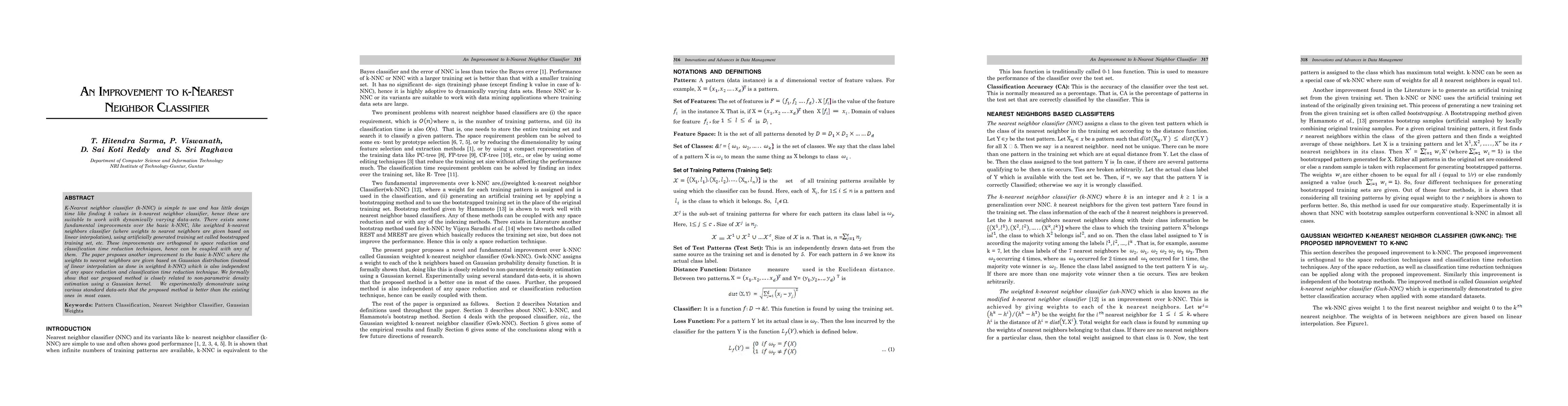 The paper proposes an enhanced k-Nearest Neighbor classifier with weights assigned based on Gaussian distribution, demonstrating improved performance over existing weighted k-NN methods, validated through experiments on standard datasets. This method is independent of space reduction and classification time reduction techniques.