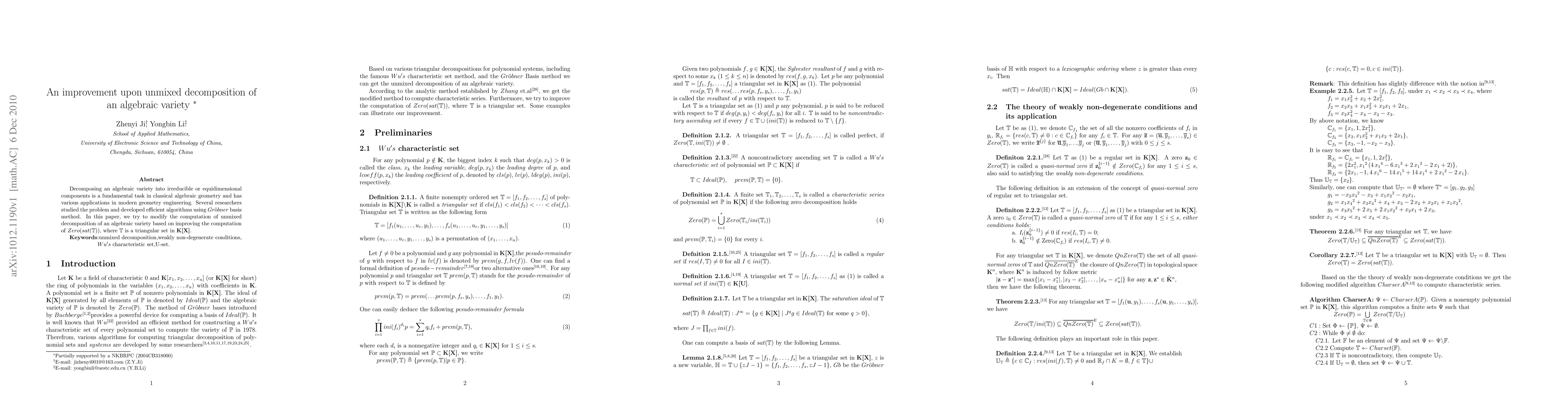 Decomposing an algebraic variety into irreducible or equidimensional components is a fundamental task in classical algebraic geometry and has various applications in modern geometry engineering. Several researchers studied the problem and developed efficient algorithms using $Gr$\"{o}$bner$ basis method. In this paper, we try to modify the computation of unmixed decomposition of an algebraic variety based on improving the computation of $Zero(sat(\mathbb{T}))$, where $\mathbb{T}$ is a triangular set in $\textbf{K[X]}$.