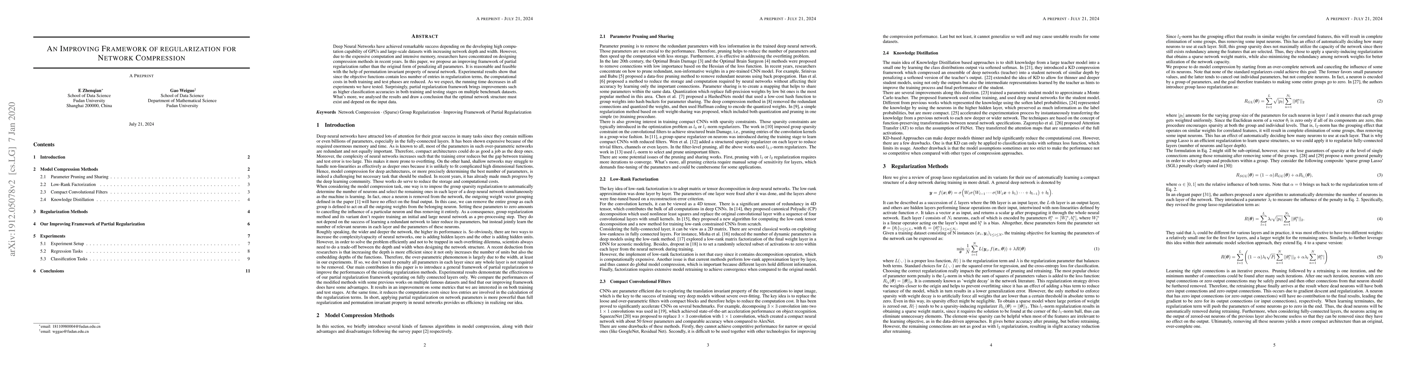 Deep Neural Networks have achieved remarkable success relying on the developing high computation capability of GPUs and large-scale datasets with increasing network depth and width in image recognition, object detection and many other applications. However, due to the expensive computation and intensive memory, researchers have concentrated on designing compression methods in recent years. In this paper, we briefly summarize the existing advanced techniques that are useful in model compression at first. After that, we give a detailed description on group lasso regularization and its variants. More importantly, we propose an improving framework of partial regularization based on the relationship between neurons and connections of adjacent layers. It is reasonable and feasible with the help of permutation property of neural network . Experiment results show that partial regularization methods brings improvements such as higher classification accuracy in both training and testing stages on multiple datasets. Since our regularizers contain the computation of less parameters, it shows competitive performances in terms of the total running time of experiments. Finally, we analysed the results and draw a conclusion that the optimal network structure must exist and depend on the input data.