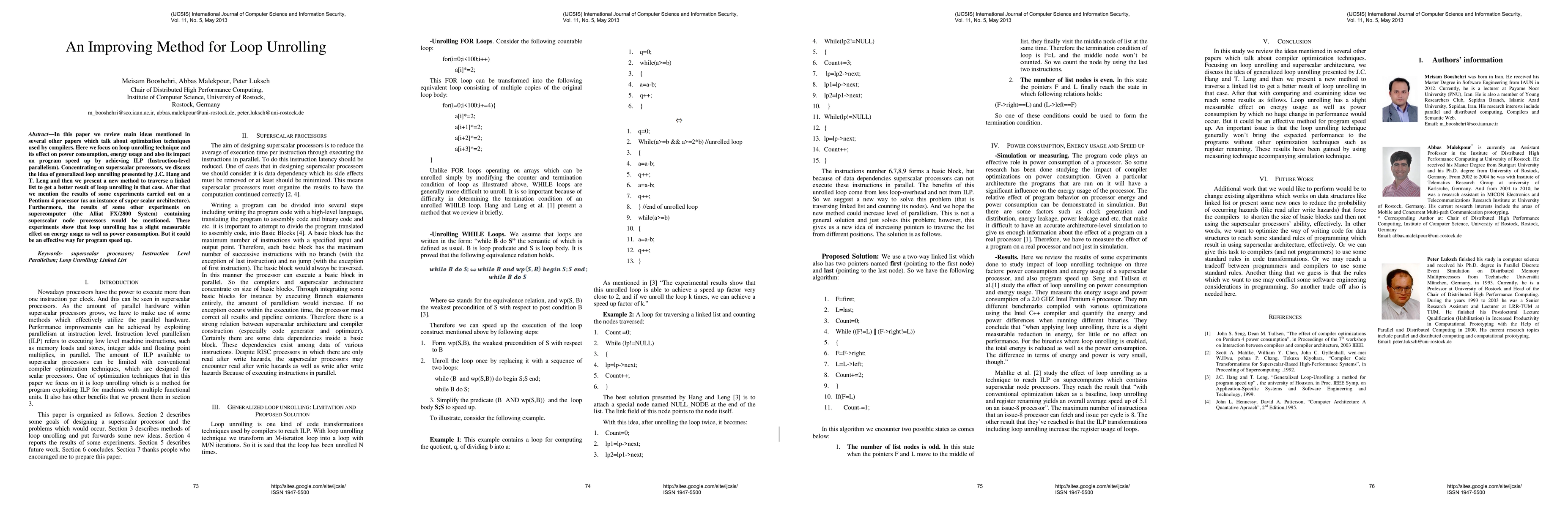 In this paper we review main ideas mentioned in several other papers which talk about optimization techniques used by compilers. Here we focus on loop unrolling technique and its effect on power consumption, energy usage and also its impact on program speed up by achieving ILP (Instruction-level parallelism). Concentrating on superscalar processors, we discuss the idea of generalized loop unrolling presented by J.C. Hang and T. Leng and then we present a new method to traverse a linked list to get a better result of loop unrolling in that case. After that we mention the results of some experiments carried out on a Pentium 4 processor (as an instance of super scalar architecture). Furthermore, the results of some other experiments on supercomputer (the Alliat FX/2800 System) containing superscalar node processors would be mentioned. These experiments show that loop unrolling has a slight measurable effect on energy usage as well as power consumption. But it could be an effective way for program speed up.