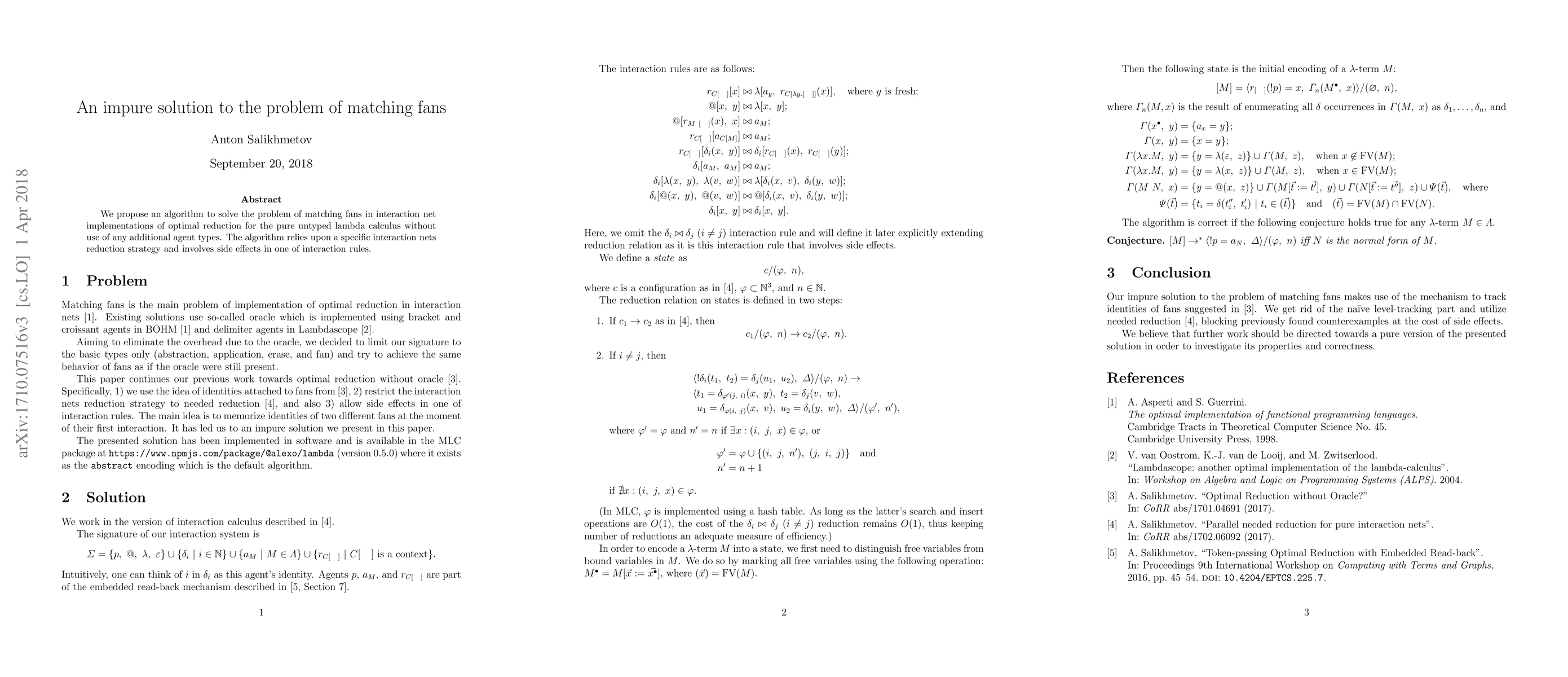 We propose an algorithm to solve the problem of matching fans in interaction net implementations of optimal reduction for the pure untyped lambda calculus without use of any additional agent types. The algorithm relies upon a specific interaction nets reduction strategy and involves side effects in one of interaction rules.