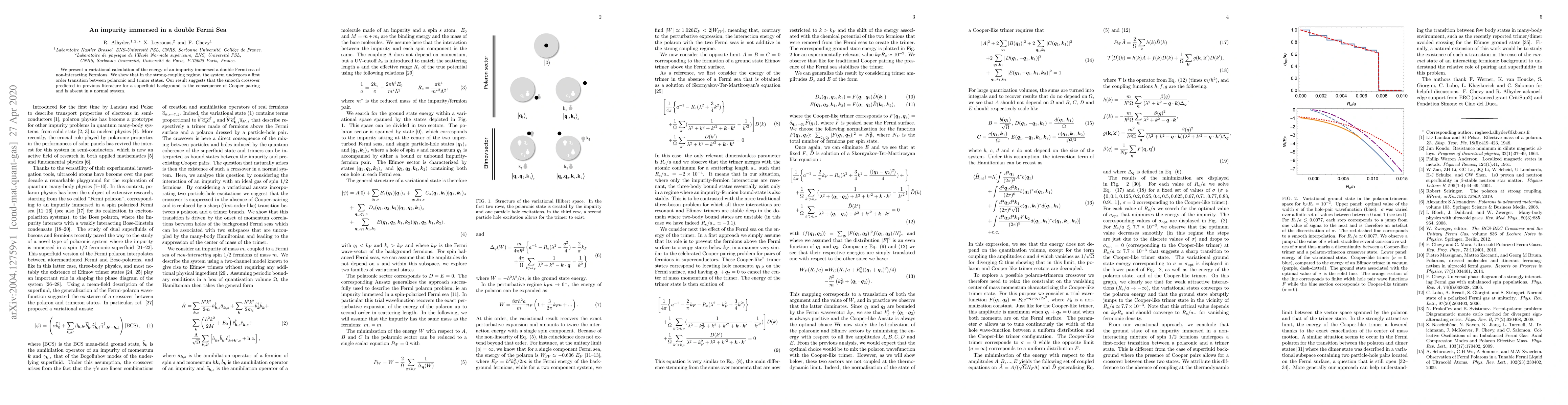 This paper investigates the energy of an impurity in a double Fermi sea using variational calculations, revealing a first-order transition between polaronic and trimer states in the strong-coupling regime. It contrasts the smooth crossover in superfluid backgrounds with the absence of such transitions in normal systems due to Cooper pairing.