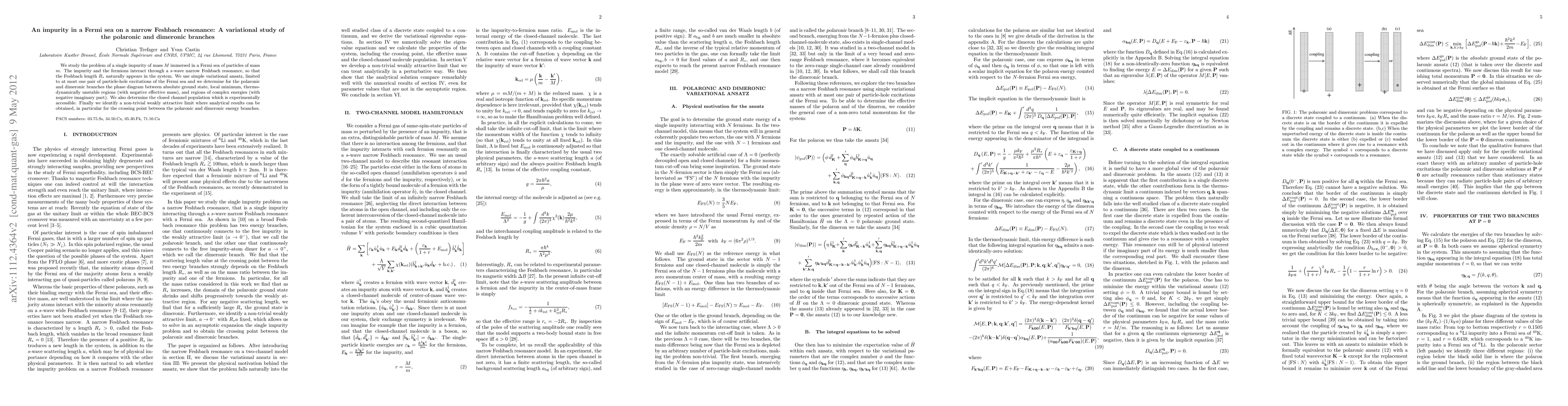 This paper investigates the interaction of a single impurity in a Fermi sea via a narrow Feshbach resonance, employing a variational method to explore the phase diagram and energy branches, including polaronic and dimeronic states, and determining experimentally accessible closed channel populations. Analytical results are derived for a weakly attractive limit, particularly for the energy branch crossing point.