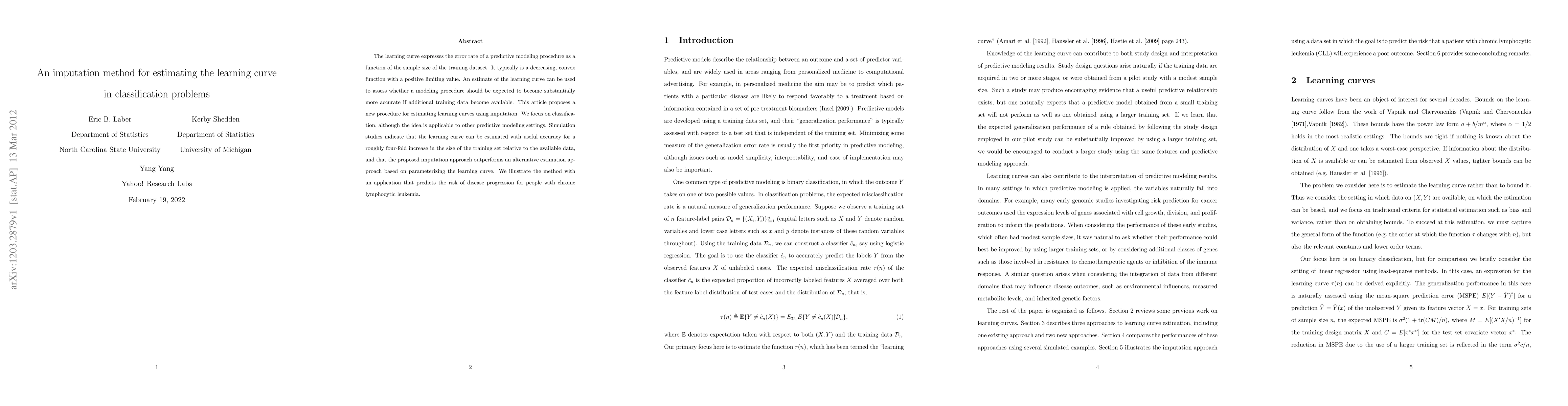 This paper proposes a new imputation method for estimating learning curves in classification problems, demonstrating its accuracy and effectiveness through simulation studies. The method outperforms alternative approaches and is illustrated with an application predicting disease progression in chronic lymphocytic leukemia.