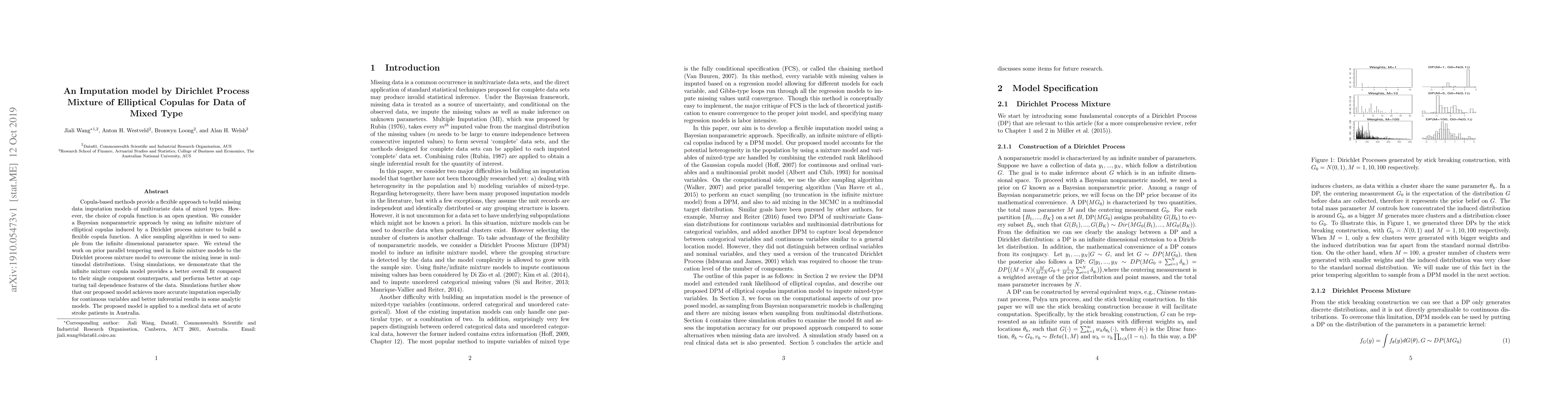 This paper proposes a Bayesian nonparametric imputation model using an infinite mixture of elliptical copulas induced by a Dirichlet process to handle mixed-type data. The model demonstrates superior performance in capturing tail dependence and provides more accurate imputations, as shown through simulations and an application to a medical dataset of acute stroke patients.