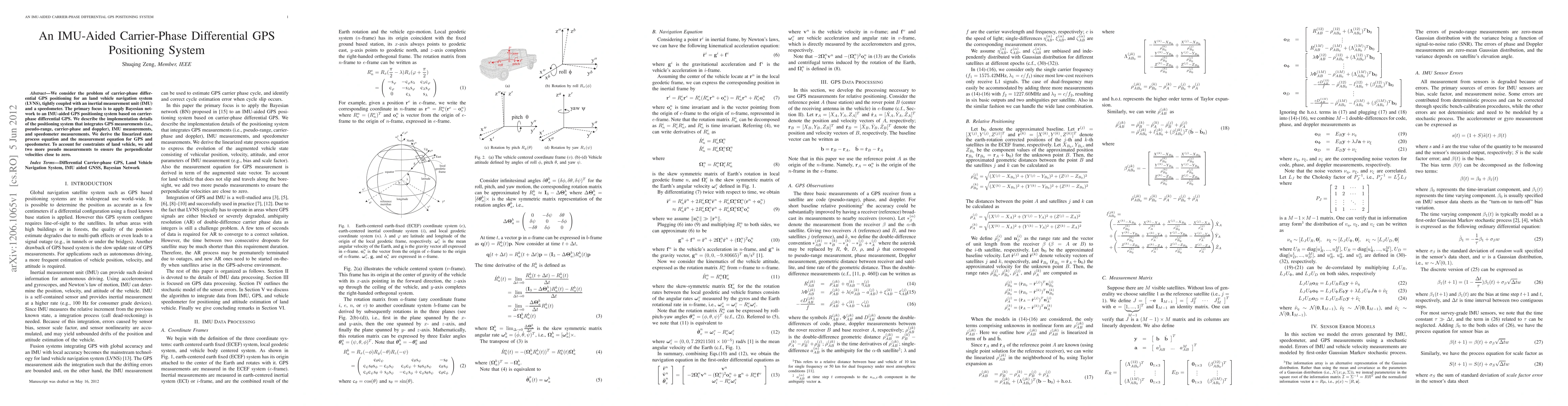 This paper proposes an IMU-aided carrier-phase differential GPS positioning system for land vehicle navigation, integrating GPS, IMU, and speedometer data using a Bayesian network. The system includes linear state and measurement equations, and additional pseudo-measurements to ensure perpendicular velocities are near zero.
