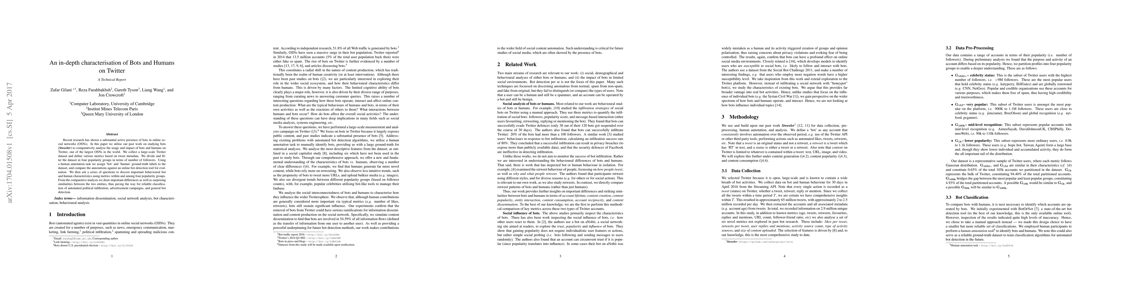 Recent research has shown a substantial active presence of bots in online social networks (OSNs). In this paper we utilise our past work on studying bots (Stweeler) to comparatively analyse the usage and impact of bots and humans on Twitter, one of the largest OSNs in the world. We collect a large-scale Twitter dataset and define various metrics based on tweet metadata. We divide and filter the dataset in four popularity groups in terms of number of followers. Using a human annotation task we assign 'bot' and 'human' ground-truth labels to the dataset, and compare the annotations against an online bot detection tool for evaluation. We then ask a series of questions to discern important behavioural bot and human characteristics using metrics within and among four popularity groups. From the comparative analysis we draw important differences as well as surprising similarities between the two entities, thus paving the way for reliable classification of automated political infiltration, advertisement campaigns, and general bot detection.