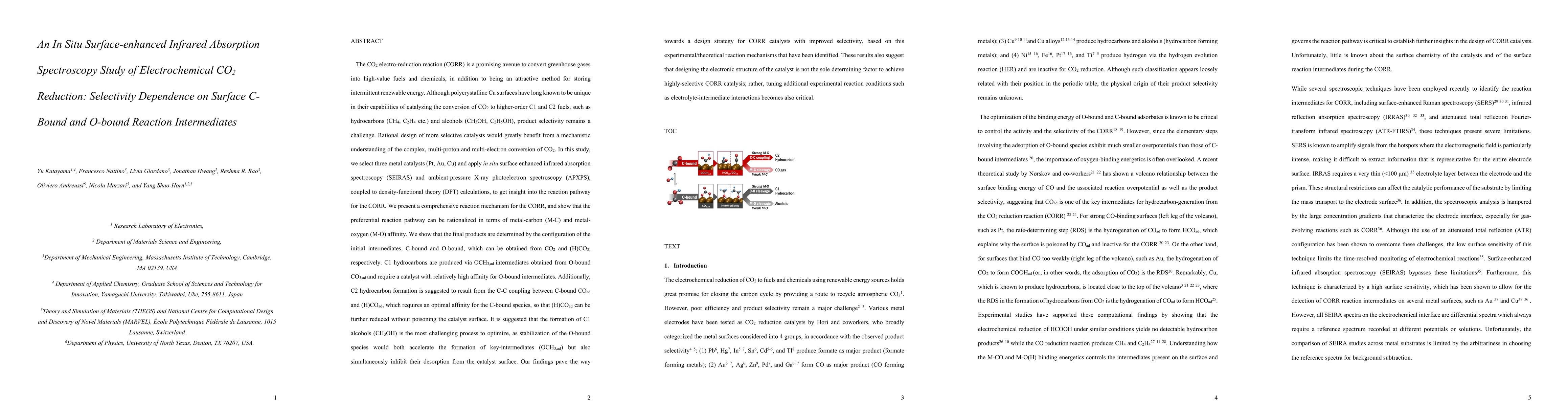 This study investigates the electrochemical CO2 reduction reaction (CORR) using in situ surface-enhanced infrared absorption spectroscopy (SEIRAS) and density-functional theory (DFT) calculations. The research reveals that product selectivity depends on the metal's affinity for C-bound and O-bound intermediates, guiding the formation of C1 and C2 hydrocarbons.