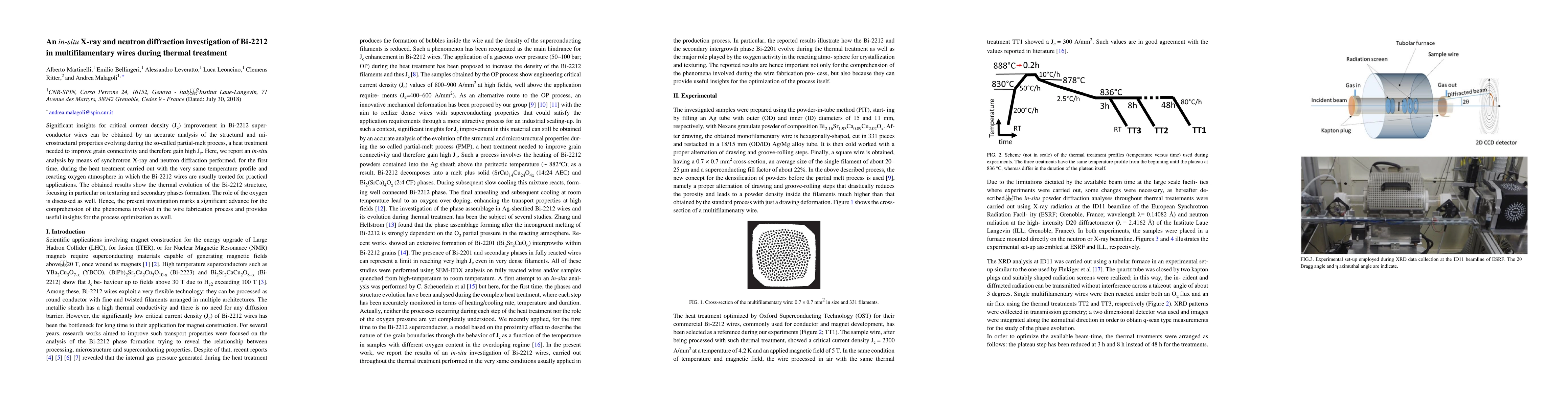 This study uses synchrotron X-ray and neutron diffraction to analyze the structural changes in Bi-2212 superconductor wires during thermal treatment, revealing insights into texturing and secondary phase formation, which are crucial for enhancing critical current density. The findings provide valuable information for optimizing the wire fabrication process.