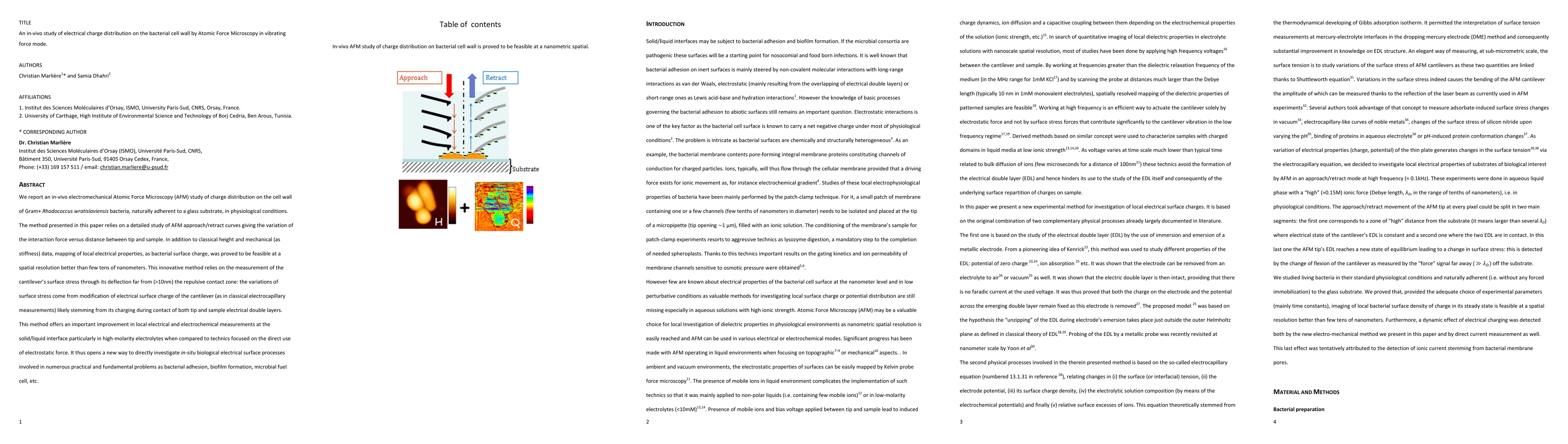 We report an in-vivo electromechanical Atomic Force Microscopy (AFM) study of charge distribution on the cell wall of Gram plus Rhodococcus wratislaviensis bacteria, naturally adherent to a glass substrate, in physiological conditions. The method presented in this paper relies on a detailed study of AFM approach-retract curves giving the variation of the interaction force versus distance between tip and sample. In addition to classical height and mechanical (as stiffness) data, mapping of local electrical properties, as bacterial surface charge, was proved to be feasible at a spatial resolution better than few tens of nanometers. This innovative method relies on the measurement of the cantilever's surface stress through its deflection far from (higher than 10nm) the repulsive contact zone. The variations of surface stress come from modification of electrical surface charge of the cantilever (as in classical electrocapillary measurements) likely stemming from its charging during contact of both tip and sample electrical double layers. This method offers an important improvement in local electrical and electrochemical measurements at the solid-liquid interface particularly in high-molarity electrolytes when compared to technics focused on the direct use of electrostatic force. It thus opens a new way to directly investigate in-situ biological electrical surface processes involved in numerous practical and fundamental problems as bacterial adhesion, biofilm formation, microbial fuel cell, etc.