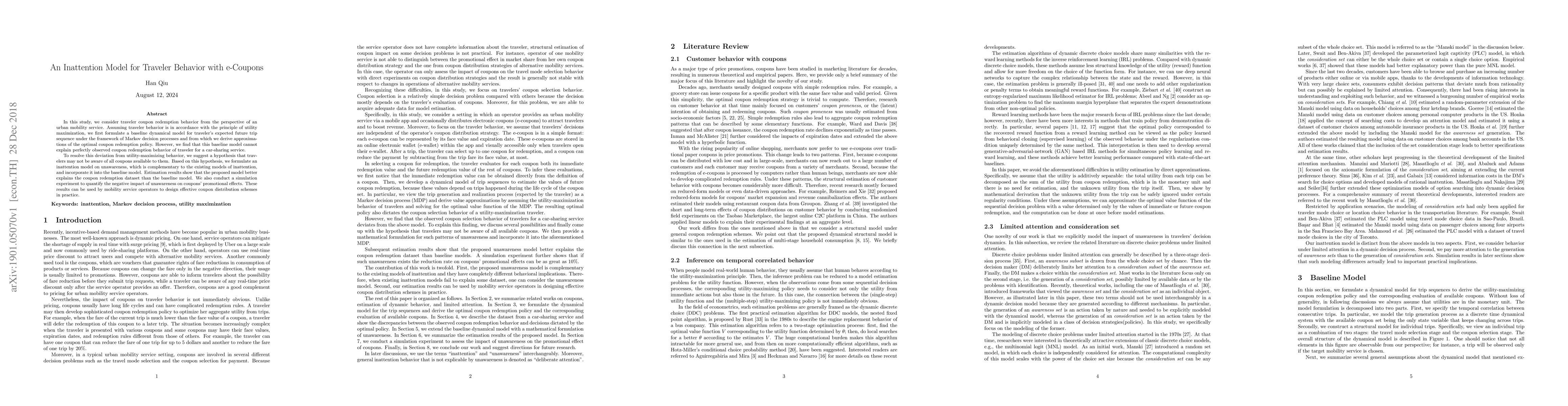 This study develops an inattention model to explain traveler coupon redemption behavior for urban mobility services, finding that travelers' unawareness of available coupons deviates from utility-maximizing behavior. The proposed model better explains observed data and highlights the negative impact of unawareness on coupon promotions, aiding service operators in designing effective coupon strategies.