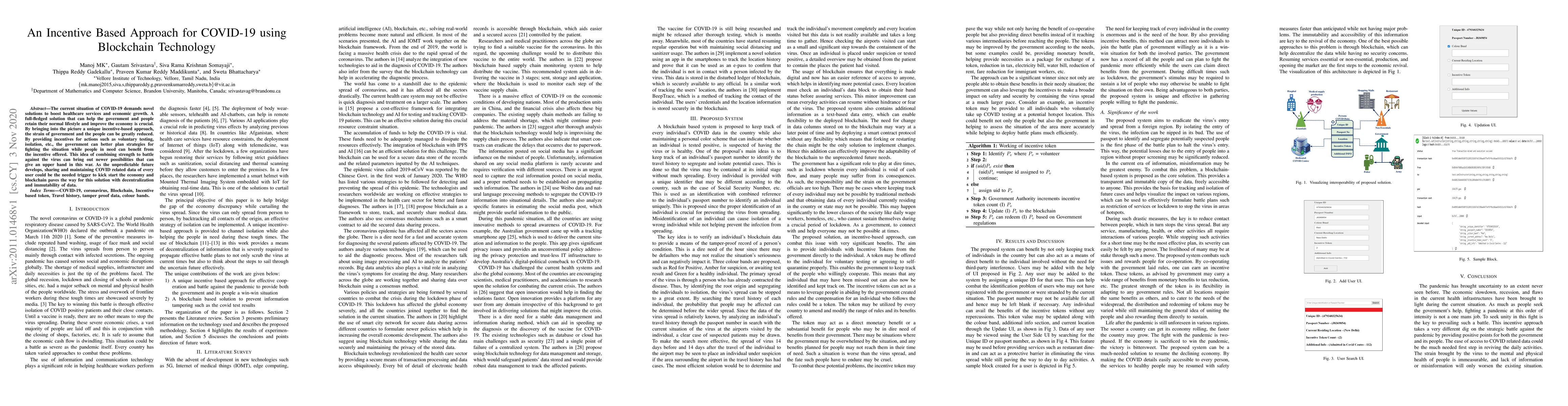 The current situation of COVID-19 demands novel solutions to boost healthcare services and economic growth. A full-fledged solution that can help the government and people retain their normal lifestyle and improve the economy is crucial. By bringing into the picture a unique incentive-based approach, the strain of government and the people can be greatly reduced. By providing incentives for actions such as voluntary testing, isolation, etc., the government can better plan strategies for fighting the situation while people in need can benefit from the incentive offered. This idea of combining strength to battle against the virus can bring out newer possibilities that can give an upper hand in this war. As the unpredictable future develops, sharing and maintaining COVID related data of every user could be the needed trigger to kick start the economy and blockchain paves the way for this solution with decentralization and immutability of data.