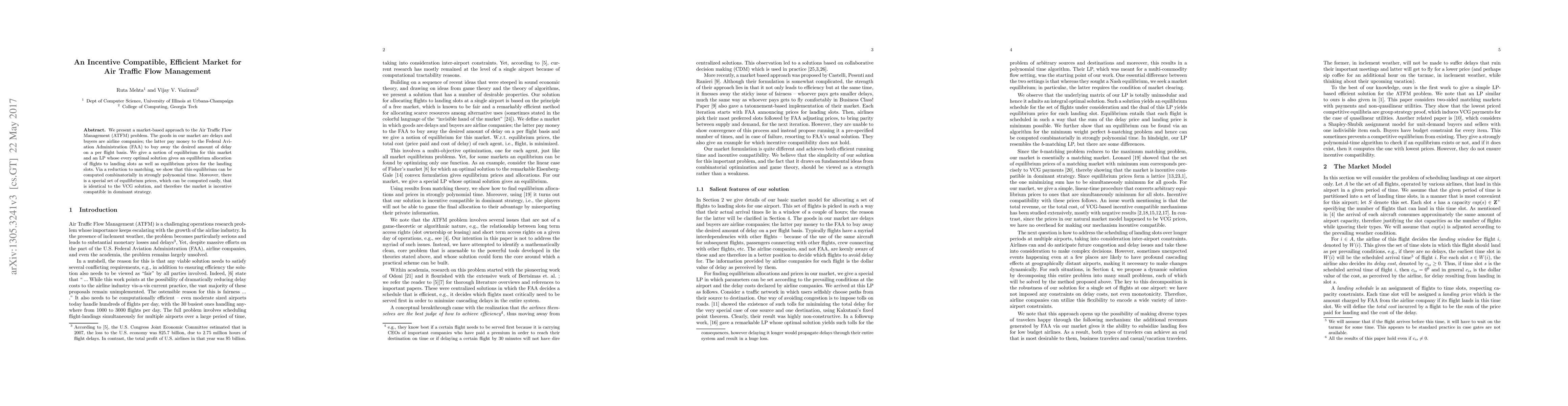 A market-based approach to managing air traffic flow aims to efficiently allocate landing slots among airlines while minimizing delays, with a solution that can be computed in strongly polynomial time.