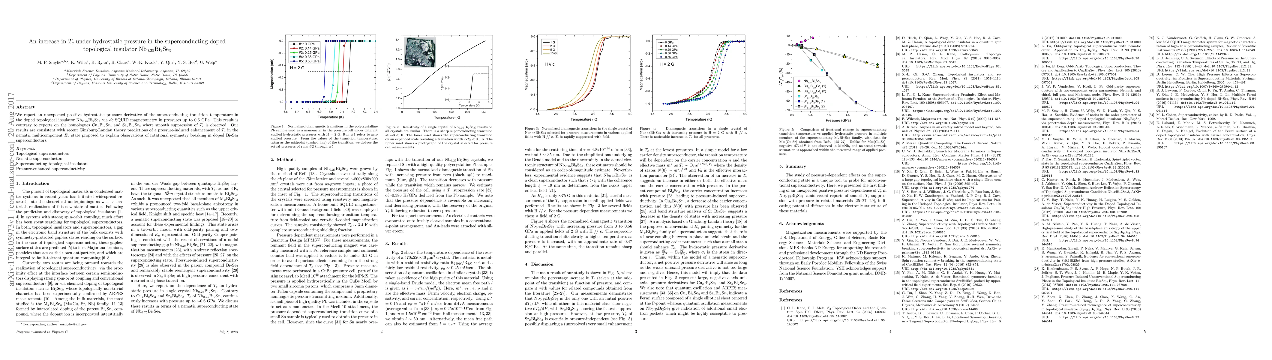 We report an unexpected positive hydrostatic pressure derivative of the superconducting transition temperature in the doped topological insulator \NBS via $dc$ SQUID magnetometry in pressures up to 0.6 GPa. This result is contrary to reports on the homologues \CBS and \SBS where smooth suppression of $T_c$ is observed. Our results are consistent with recent Ginzburg-Landau theory predictions of a pressure-induced enhancement of $T_c$ in the nematic multicomponent $E_u$ state proposed to explain observations of rotational symmetry breaking in doped Bi$_2$Se$_3$ superconductors.