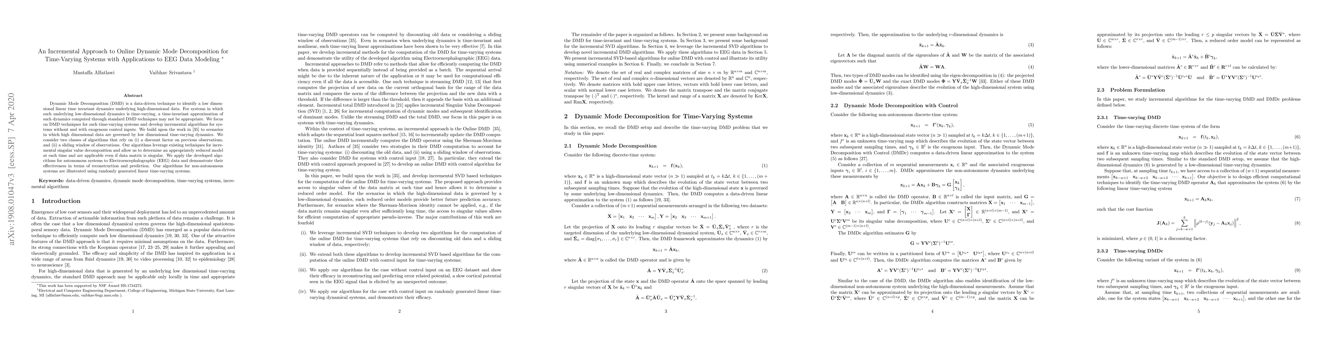 This paper proposes incremental algorithms for Dynamic Mode Decomposition (DMD) to handle time-varying systems, focusing on both autonomous and controlled scenarios. The approach uses discount factors and sliding windows to update models incrementally, demonstrating effectiveness in EEG data modeling and randomly generated systems.