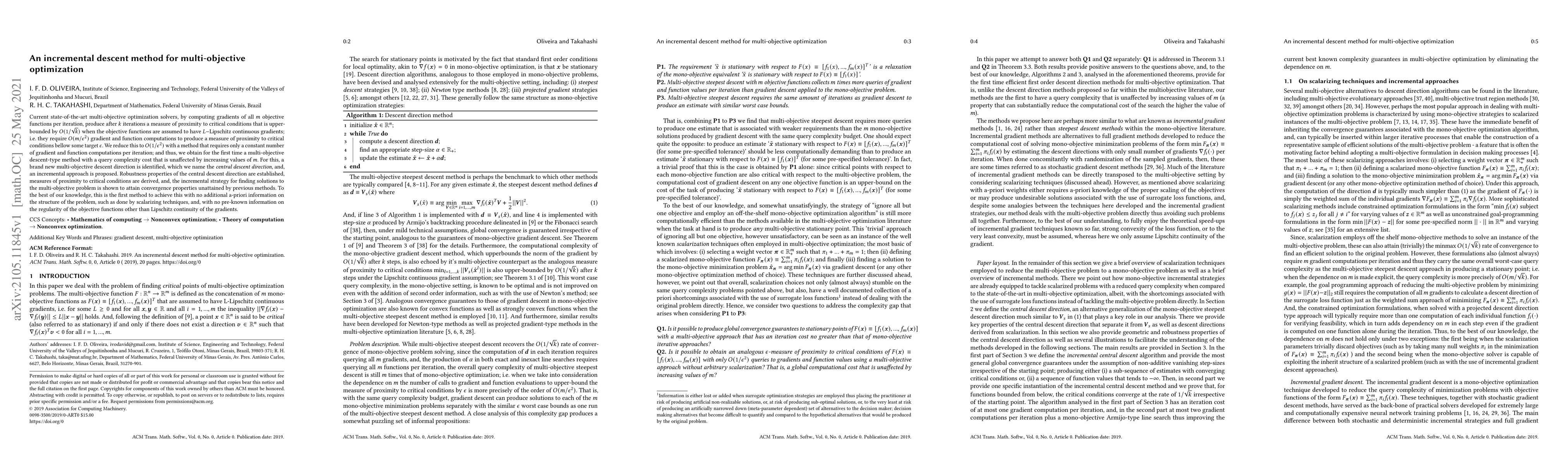 This paper introduces an incremental descent method for multi-objective optimization that reduces computational complexity from $O(m/\epsilon^2)$ to $O(1/\epsilon^2)$ by identifying a new "central descent direction" and employing an incremental approach. This method achieves convergence without requiring additional problem-specific information.