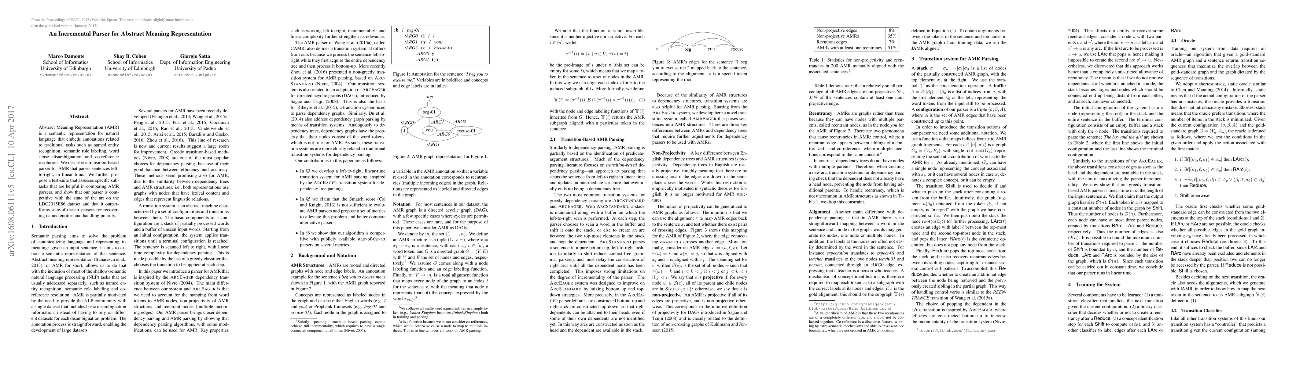 This paper introduces a linear-time, left-to-right incremental parser for Abstract Meaning Representation (AMR), outperforming state-of-the-art in named entity recognition and polarity handling, and presents a test-suite for comparing AMR parsers.