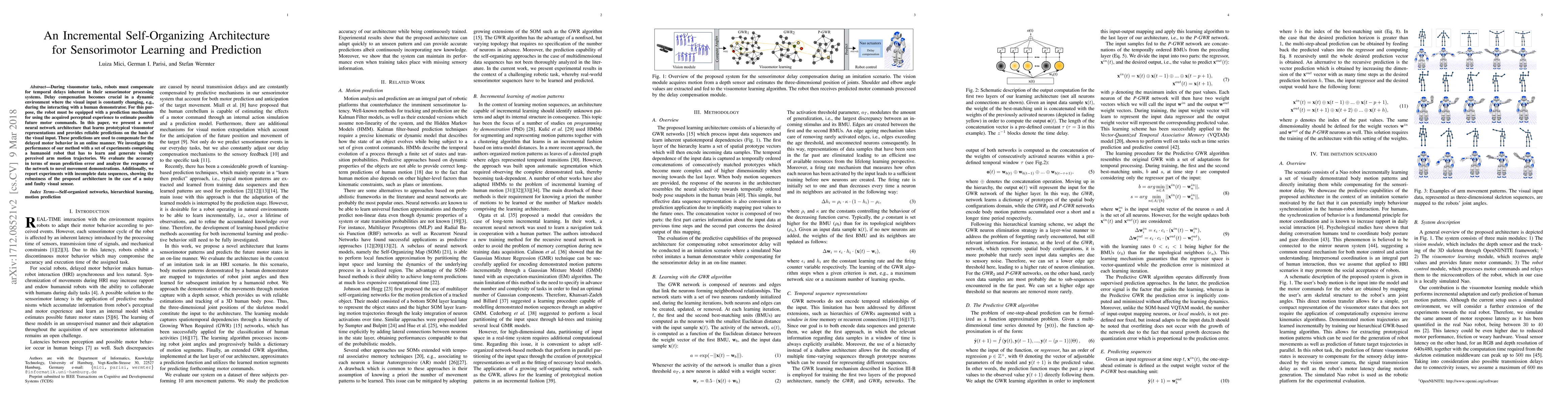 During visuomotor tasks, robots must compensate for temporal delays inherent in their sensorimotor processing systems. Delay compensation becomes crucial in a dynamic environment where the visual input is constantly changing, e.g., during the interacting with a human demonstrator. For this purpose, the robot must be equipped with a prediction mechanism for using the acquired perceptual experience to estimate possible future motor commands. In this paper, we present a novel neural network architecture that learns prototypical visuomotor representations and provides reliable predictions on the basis of the visual input. These predictions are used to compensate for the delayed motor behavior in an online manner. We investigate the performance of our method with a set of experiments comprising a humanoid robot that has to learn and generate visually perceived arm motion trajectories. We evaluate the accuracy in terms of mean prediction error and analyze the response of the network to novel movement demonstrations. Additionally, we report experiments with incomplete data sequences, showing the robustness of the proposed architecture in the case of a noisy and faulty visual sensor.