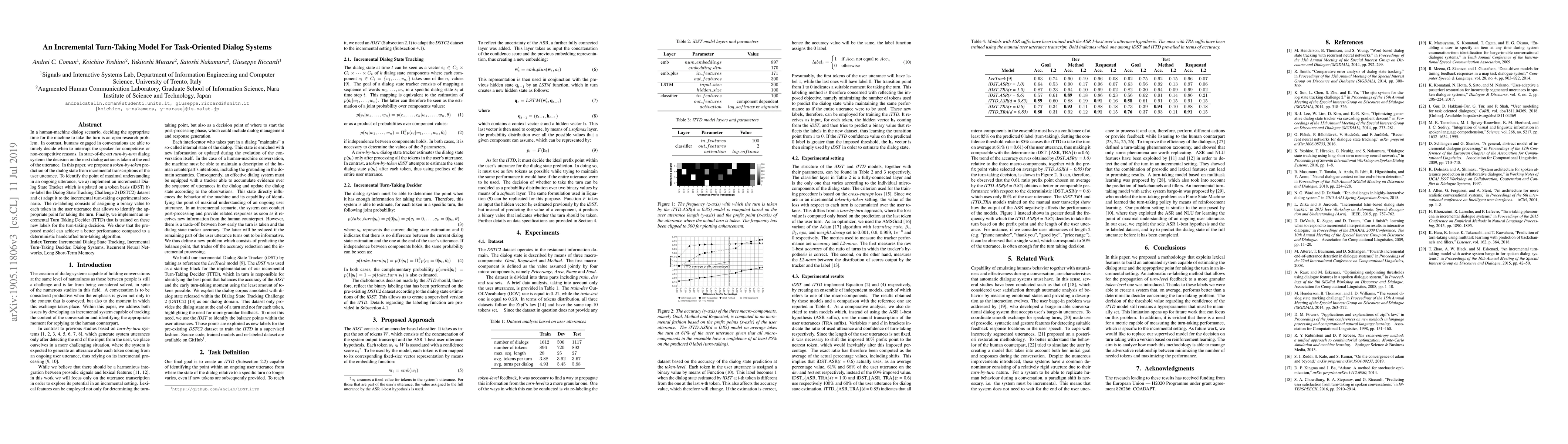 This paper proposes an incremental turn-taking model for task-oriented dialog systems, utilizing an incremental Dialog State Tracker (iDST) and an Incremental Turn Taking Decider (iTTD) to predict the optimal time for the machine to take the turn based on token-by-token analysis of user utterances. The model outperforms deterministic handcrafted algorithms in identifying the best points for turn-taking.