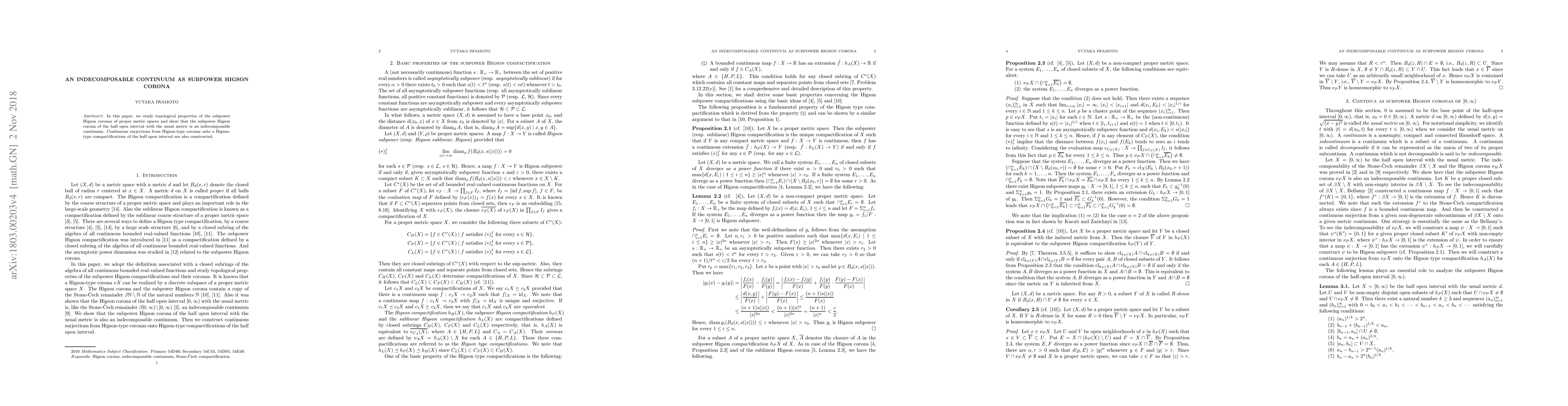 This paper investigates the topological characteristics of subpower Higson coronas of proper metric spaces, demonstrating that the subpower Higson corona of the half-open interval is an indecomposable continuum. It also constructs surjective maps from Higson type coronas to Higson type compactifications of the half-open interval.