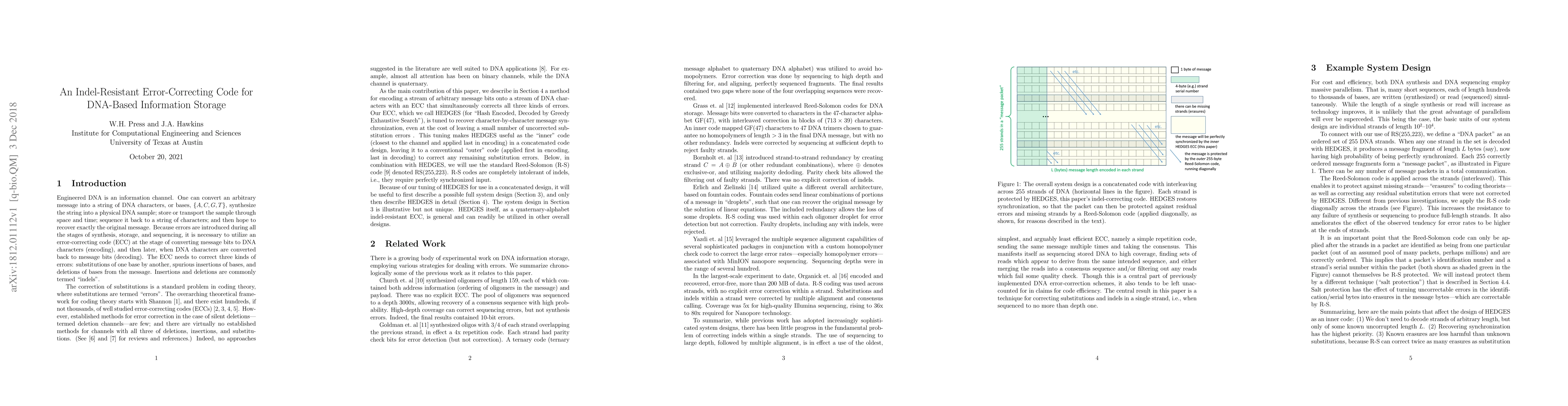 This paper introduces "HEDGES," an indel-resistant error-correcting code for DNA storage, capable of correcting substitutions, insertions, and deletions in a single read, achieving up to 10% error correction and surpassing 50% of the Shannon limit. Unlike previous methods, it eliminates the need for inefficient multiple-repetition codes.