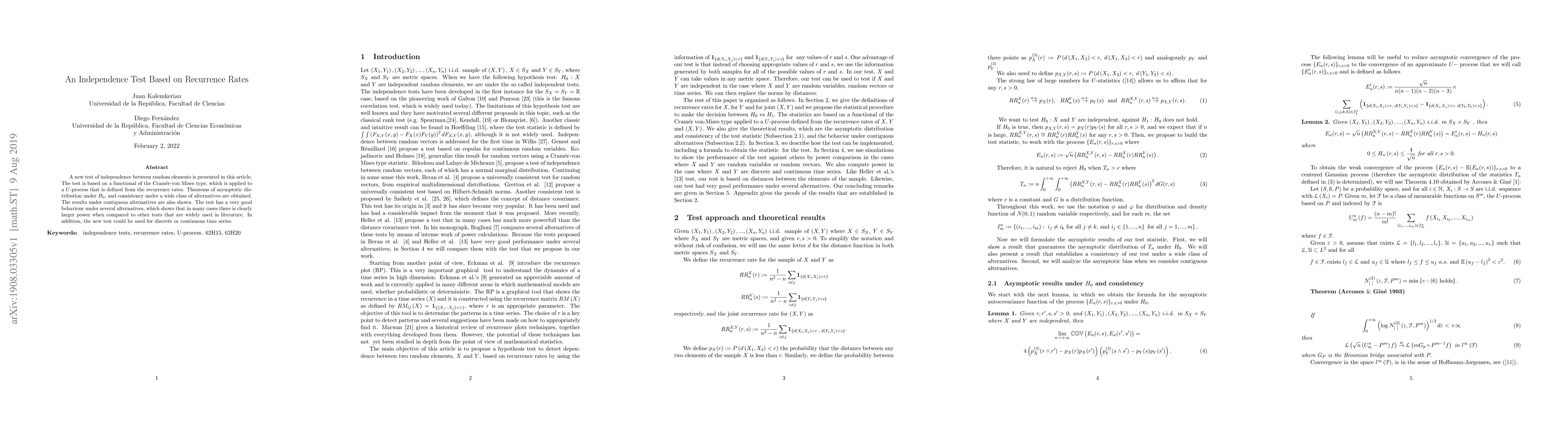 A new test of independence between random elements is presented in this article. The test is based on a functional of the Cram\'{e}r-von Mises type, which is applied to a $U$-process that is defined from the recurrence rates. Theorems of asymptotic distribution under $H_{0},$ and consistency under a wide class of alternatives are obtained. The results under contiguous alternatives are also shown. The test has a very good behaviour under several alternatives, which shows that in many cases there is clearly larger power when compared to other tests that are widely used in literature. In addition, the new test could be used for discrete or continuous time series.