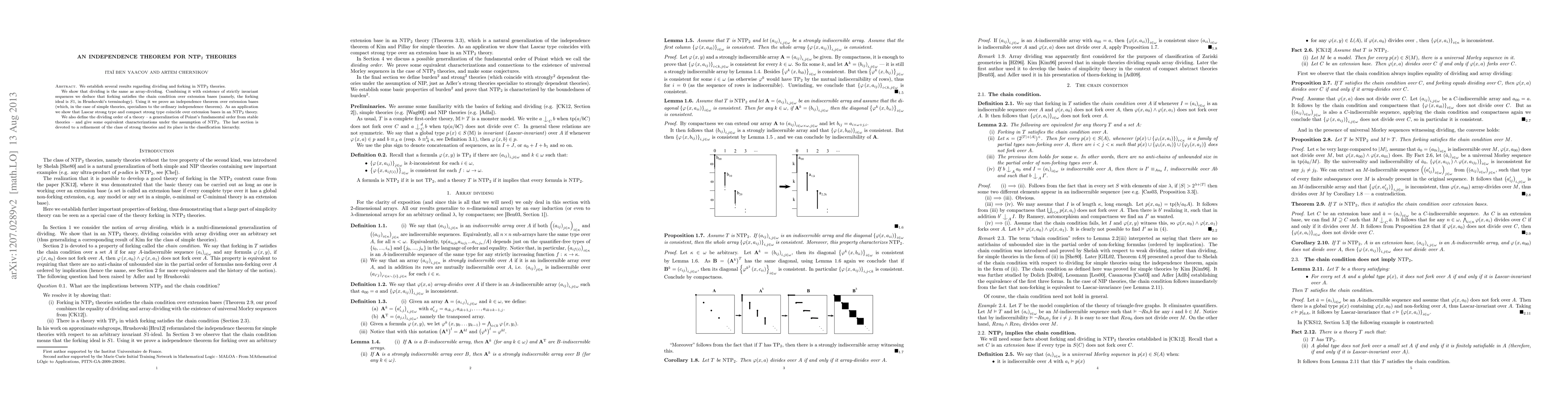This paper establishes results on dividing and forking in NTP2 theories, proving that dividing equals array-dividing and that forking satisfies the chain condition. It also proves an independence theorem and shows the equivalence of Lascar strong type and compact strong type in NTP2 theories.