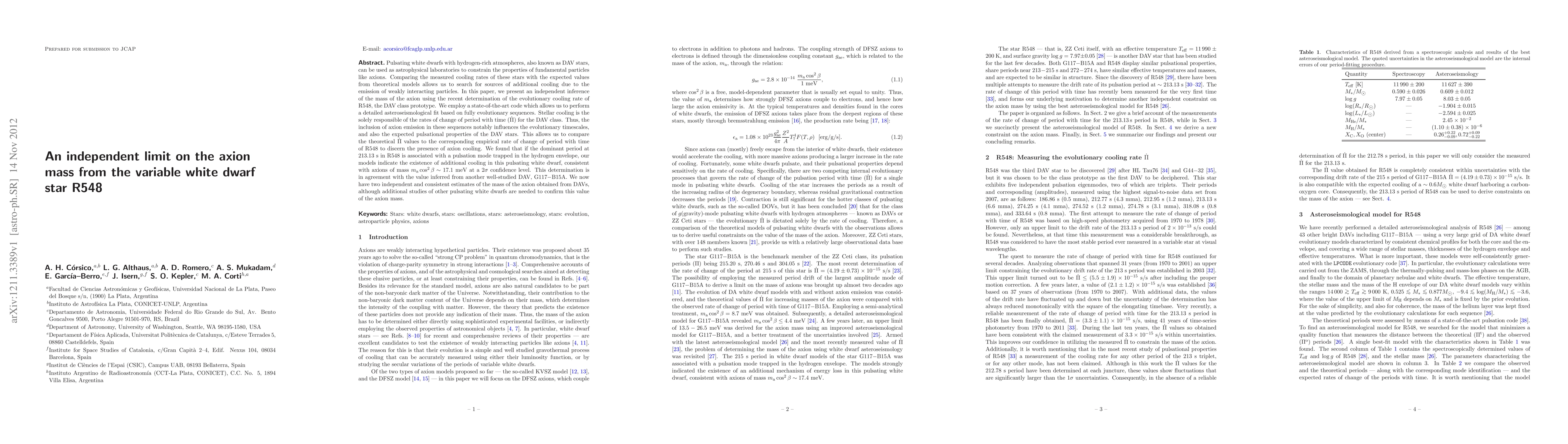 Pulsating white dwarfs with hydrogen-rich atmospheres, also known as DAV stars, can be used as astrophysical laboratories to constrain the properties of fundamental particles like axions. Comparing the measured cooling rates of these stars with the expected values from theoretical models allows us to search for sources of additional cooling due to the emission of weakly interacting particles. In this paper, we present an independent inference of the mass of the axion using the recent determination of the evolutionary cooling rate of R548, the DAV class prototype. We employ a state-of-the-art code which allows us to perform a detailed asteroseismological fit based on fully evolutionary sequences. Stellar cooling is the solely responsible of the rates of change of period with time ($\dot\Pi$) for the DAV class. Thus, the inclusion of axion emission in these sequences notably influences the evolutionary timescales, and also the expected pulsational properties of the DAV stars. This allows us to compare the theoretical $\dot\Pi$ values to the corresponding empirical rate of change of period with time of R548 to discern the presence of axion cooling. We found that if the dominant period at 213.13 s in R548 is associated with a pulsation mode trapped in the hydrogen envelope, our models indicate the existence of additional cooling in this pulsating white dwarf, consistent with axions of mass $m_{\rm a} \cos^2 \beta \sim 17.1$ meV at a 2$\sigma$ confidence level. This determination is in agreement with the value inferred from another well-studied DAV, G117$-$B15A. We now have two independent and consistent estimates of the mass of the axion obtained from DAVs, although additional studies of other pulsating white dwarfs are needed to confirm this value of the axion mass.