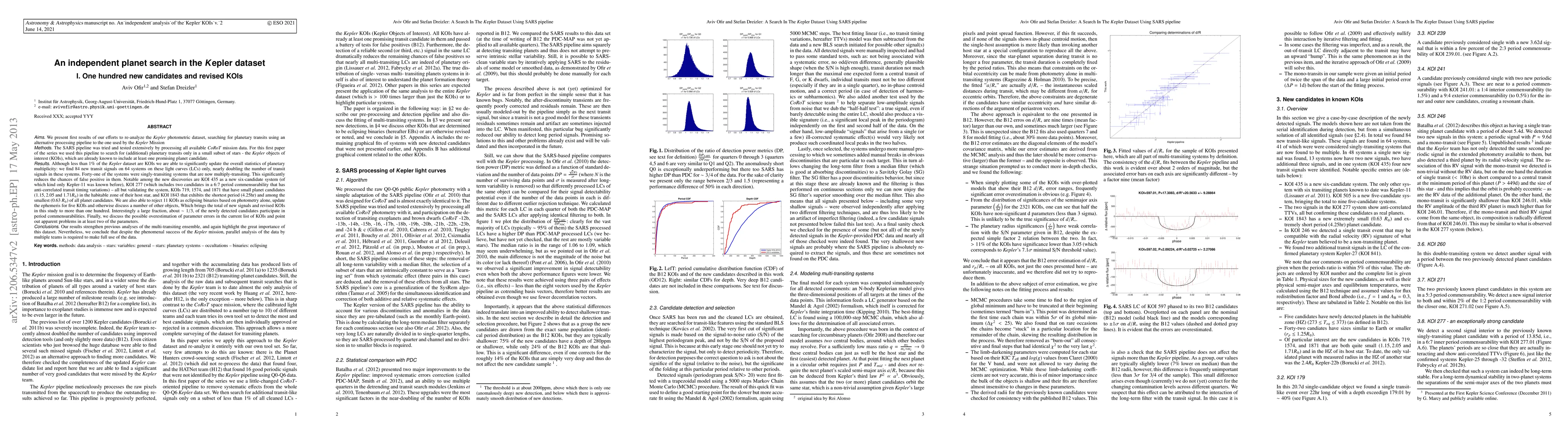 Aims. We present our re-analyze the Kepler photometric dataset, searching for planetary transits using an alternative processing pipeline to the one used by the Kepler Mission. Methods. The SARS pipeline was tested extensively by processing all available CoRoT data. We used this pipeline to search for (additional) planetary transits only in the Kepler objects of interest (KOIs). Results. Although less than 1% of the Kepler dataset are KOIs we are able to significantly update the overall statistics of planetary multiplicity: we find 84 new transit signals on 64 systems on these light curves only, nearly doubling the number of transit signals in these systems. Forty-one of the systems were singly-transiting systems that are now multiply-transiting. Notable among the new discoveries are KOI 435 as a new six-candidate system (of which kind only Kepler-11 was known before), KOI 277 (which includes two candidates in a 6:7 resonance and anti-correlated transit timing variations) - all but validating the system, KOIs 719, 1574, and 1871 that have small planet candidates (1.15, 2.05 and 1.71R_Earth) in the habitable zone of their host star, and KOI 1843 that exhibits the shortest period (4.25hr) and among the smallest (0.63 R_Earth) of all planet candidates. We are also able to reject 11 KOIs as eclipsing binaries, update the ephemeris for five KOIs and otherwise discuss yet other objects. Interestingly, about 1/3 of the newly detected candidates participate in period commensurabilities. Finally, we discuss the possible overestimation of parameter errors in the current list of KOIs. Conclusions. Our results strengthen previous analyses of the multi-transiting ensemble. Nevertheless, we conclude that despite the phenomenal success of the Kepler mission, parallel analysis of the data by multiple teams is required to make full use of the data. [ABRIDGED]