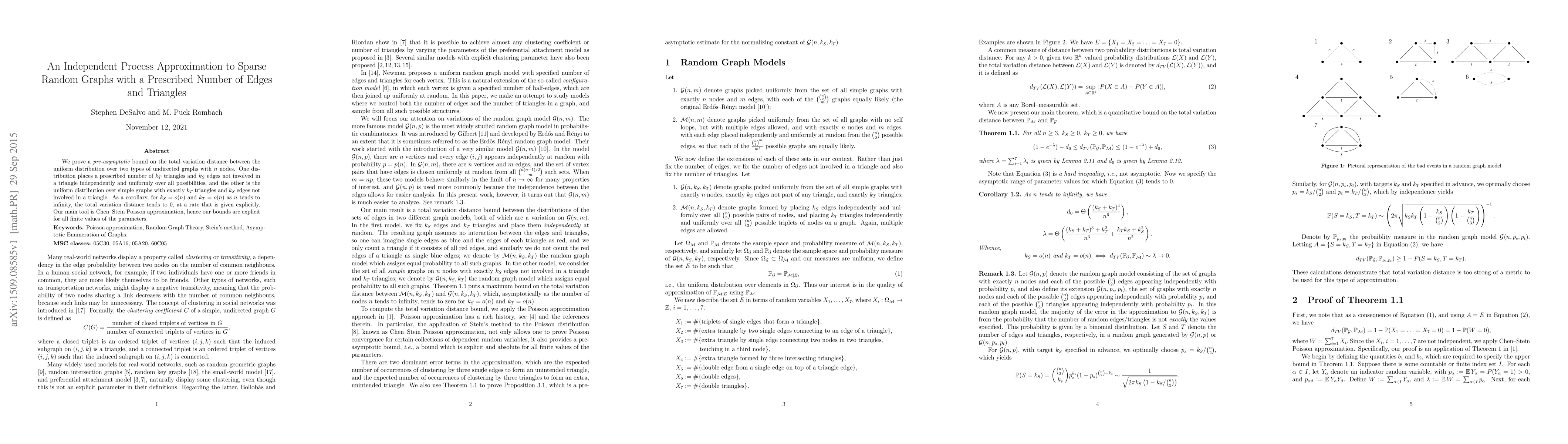 Researchers prove a bound on the similarity between two types of sparse random graphs with prescribed edges and triangles, showing that their distributions tend to 0 as the number of nodes increases.