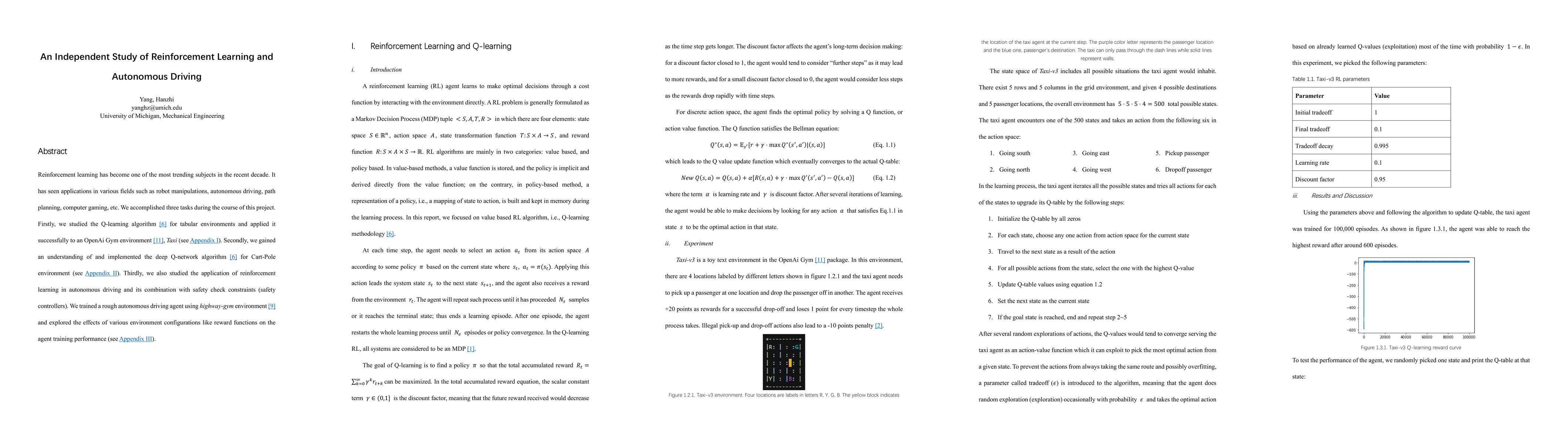 Reinforcement learning has become one of the most trending subjects in the recent decade. It has seen applications in various fields such as robot manipulations, autonomous driving, path planning, computer gaming, etc. We accomplished three tasks during the course of this project. Firstly, we studied the Q-learning algorithm for tabular environments and applied it successfully to an OpenAi Gym environment, Taxi. Secondly, we gained an understanding of and implemented the deep Q-network algorithm for Cart-Pole environment. Thirdly, we also studied the application of reinforcement learning in autonomous driving and its combination with safety check constraints (safety controllers). We trained a rough autonomous driving agent using highway-gym environment and explored the effects of various environment configurations like reward functions on the agent training performance.