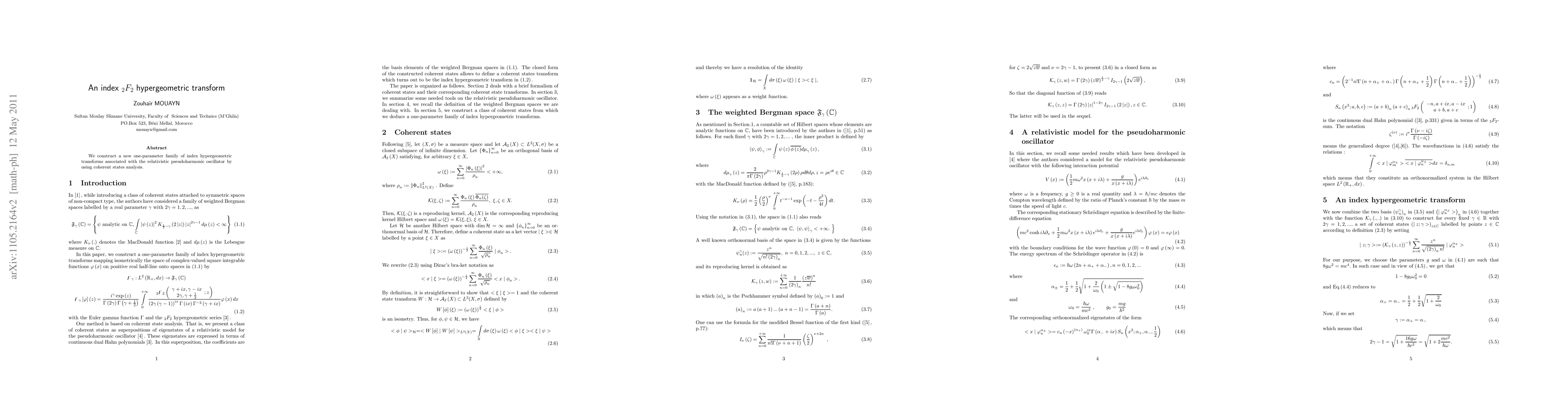 Summary: This paper introduces a new family of index hypergeometric transforms linked to the relativistic pseudoharmonic oscillator, developed through coherent states analysis. The transforms may have applications in quantum field theory and mathematical physics.