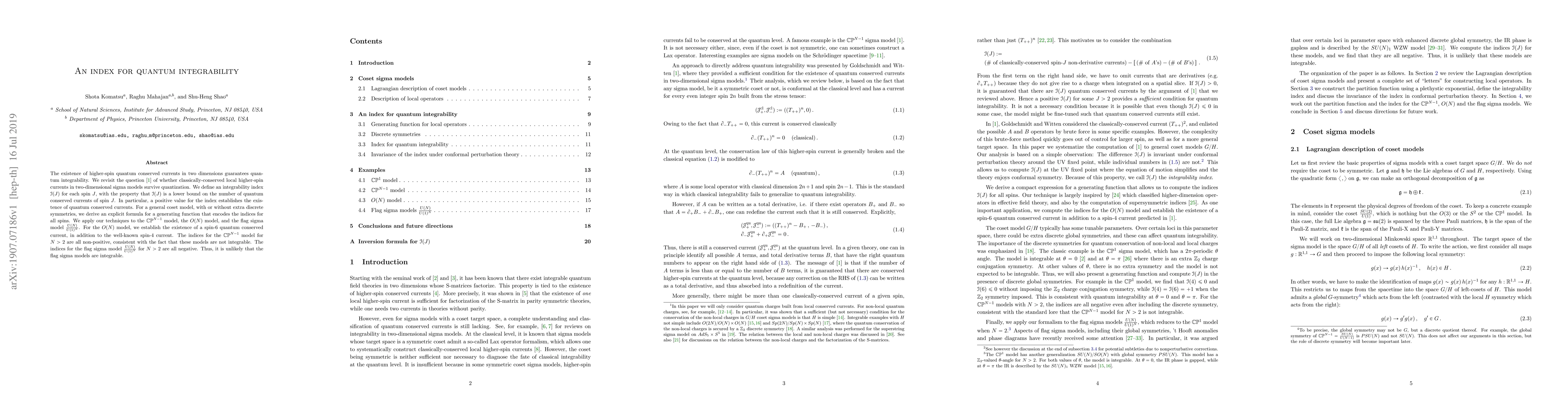 The existence of higher-spin quantum conserved currents in two dimensions guarantees quantum integrability. We revisit the question of whether classically-conserved local higher-spin currents in two-dimensional sigma models survive quantization. We define an integrability index $\mathcal{I}(J)$ for each spin $J$, with the property that $\mathcal{I}(J)$ is a lower bound on the number of quantum conserved currents of spin $J$. In particular, a positive value for the index establishes the existence of quantum conserved currents. For a general coset model, with or without extra discrete symmetries, we derive an explicit formula for a generating function that encodes the indices for all spins. We apply our techniques to the $\mathbb{CP}^{N-1}$ model, the $O(N)$ model, and the flag sigma model $\frac{U(N)}{U(1)^{N}}$. For the $O(N)$ model, we establish the existence of a spin-6 quantum conserved current, in addition to the well-known spin-4 current. The indices for the $\mathbb{CP}^{N-1}$ model for $N>2$ are all non-positive, consistent with the fact that these models are not integrable. The indices for the flag sigma model $\frac{U(N)}{U(1)^{N}}$ for $N>2$ are all negative. Thus, it is unlikely that the flag sigma models are integrable.
