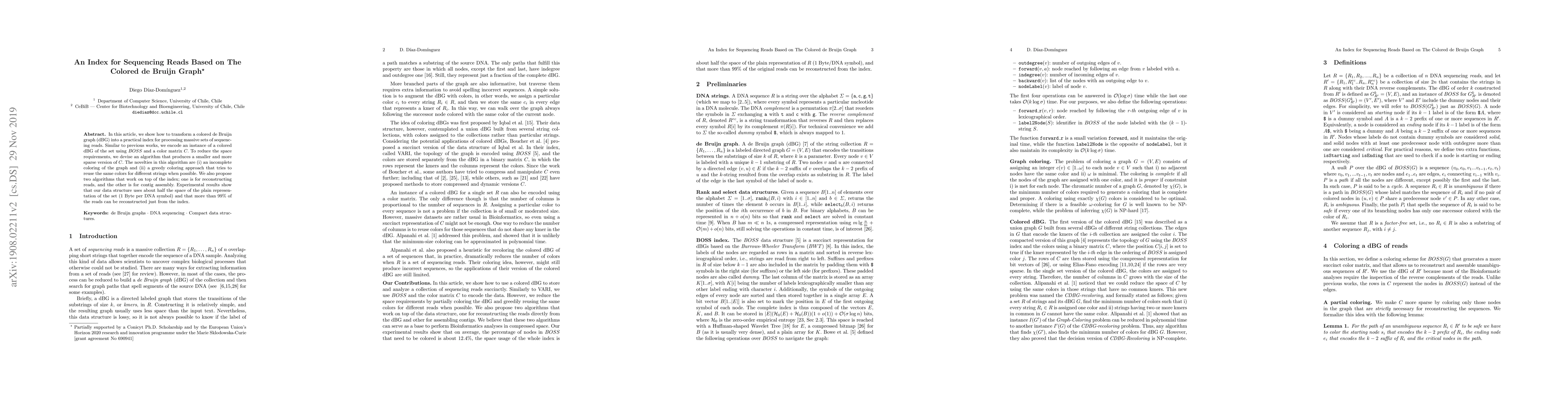 In this article, we show how to transform a colored de Bruijn graph (dBG) into a practical index for processing massive sets of sequencing reads. Similar to previous works, we encode an instance of a colored dBG of the set using BOSS and a color matrix C. To reduce the space requirements, we devise an algorithm that produces a smaller and more sparse version of C. The novelties in this algorithm are (i) an incomplete coloring of the graph and (ii) a greedy coloring approach that tries to reuse the same colors for different strings when possible. We also propose two algorithms that work on top of the index; one is for reconstructing reads, and the other is for contig assembly. Experimental results show that our data structure uses about half the space of the plain representation of the set (1 Byte per DNA symbol) and that more than 99% of the reads can be reconstructed just from the index.