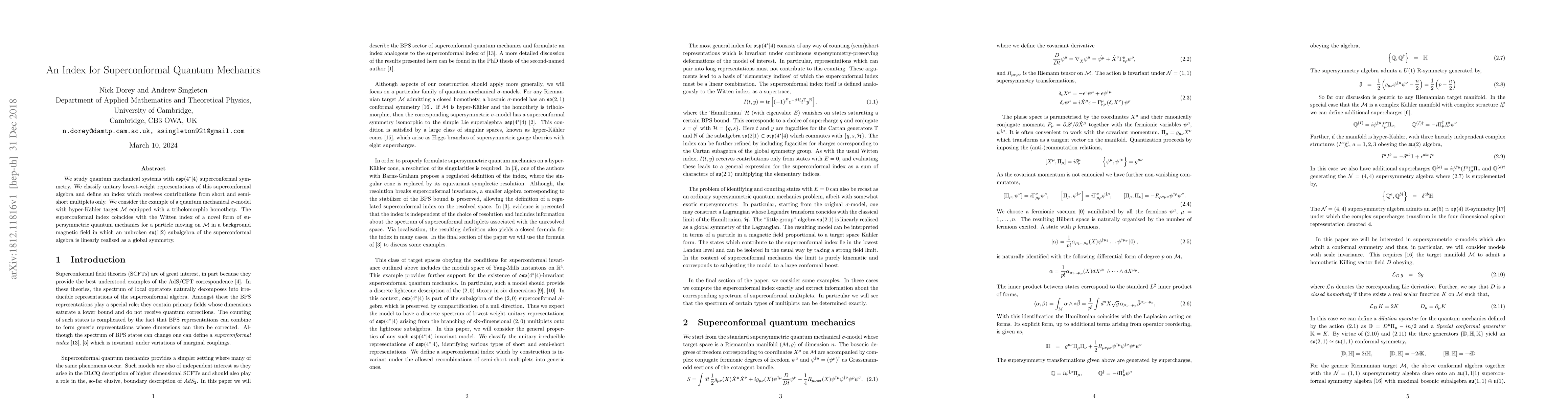 We study quantum mechanical systems with $\mathfrak{osp}(4^{*}|4)$ superconformal symmetry. We classify unitary lowest-weight representations of this superconformal algebra and define an index which receives contributions from short and semi-short multiplets only. We consider the example of a quantum mechanical $\sigma$-model with hyper-K\"{a}hler target $\mathcal{M}$ equipped with a triholomorphic homothety. The superconformal index coincides with the Witten index of a novel form of supersymmetric quantum mechanics for a particle moving on $\mathcal{M}$ in a background magnetic field in which an unbroken $\mathfrak{su}(1|2)$ subalgebra of the superconformal algebra is linearly realised as a global symmetry.