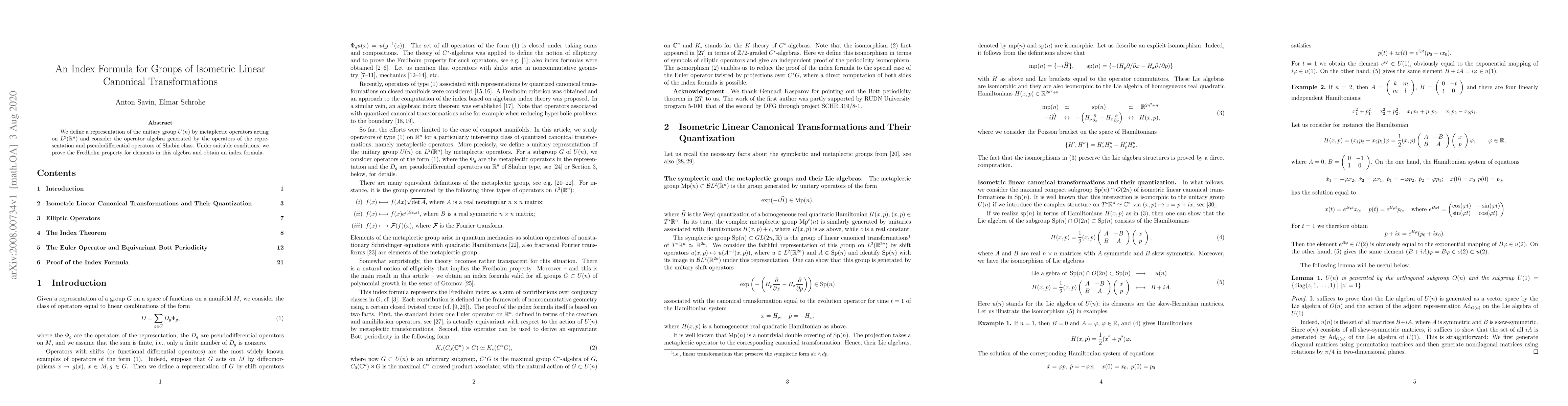 This paper defines a representation of the unitary group $U(n)$ through metaplectic operators on $L^2(\mathbb{R}^n)$ and proves the Fredholm property for elements in the algebra generated by these operators and Shubin class pseudodifferential operators, leading to an index formula.