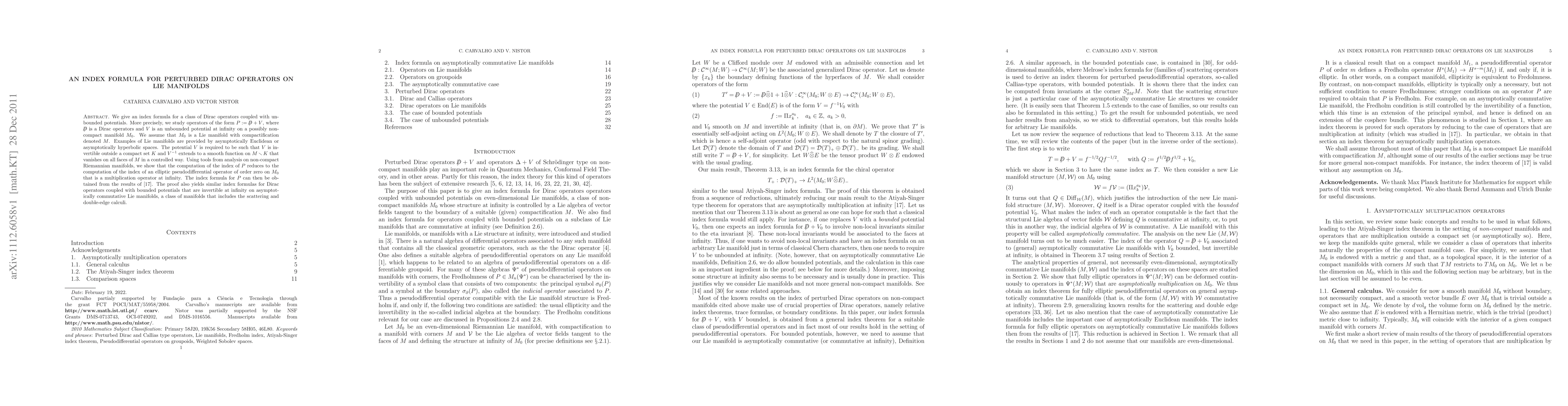 This paper presents an index formula for perturbed Dirac operators on Lie manifolds, specifically operators of the form P = D + V where D is a Dirac operator and V is an unbounded potential. The authors demonstrate that the index computation of P reduces to that of an elliptic pseudodifferential operator on the manifold, using tools from analysis on non-compact Riemannian manifolds.