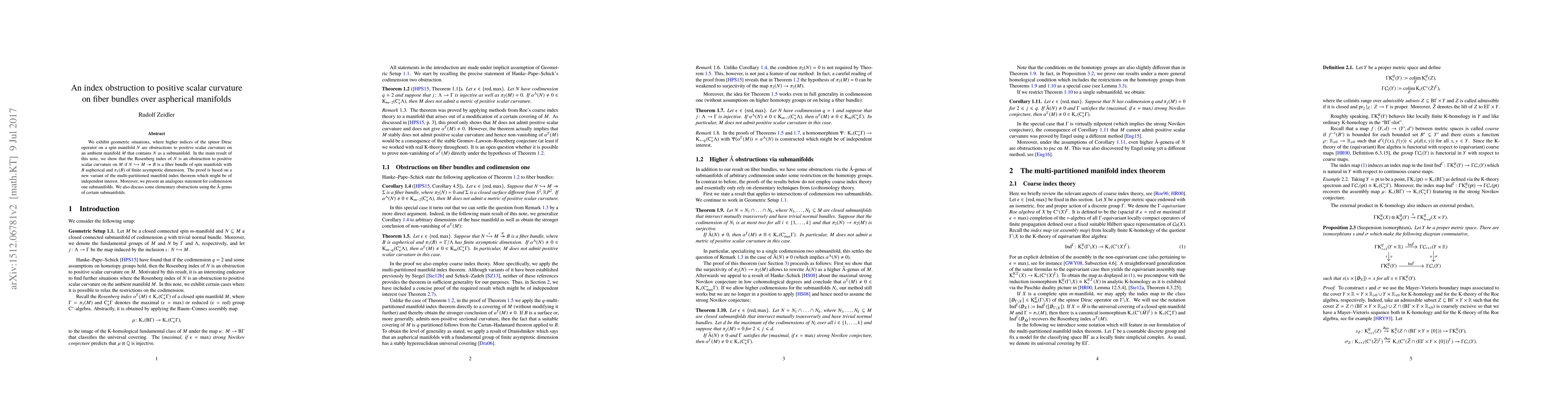 This paper demonstrates that higher indices of the spinor Dirac operator on a spin manifold $N$ serve as obstructions to positive scalar curvature on an ambient manifold $M$ when $N$ is embedded in $M$ and $M$ is a fiber bundle over an aspherical manifold $B$. The proof utilizes a new variant of the multi-partitioned manifold index theorem.