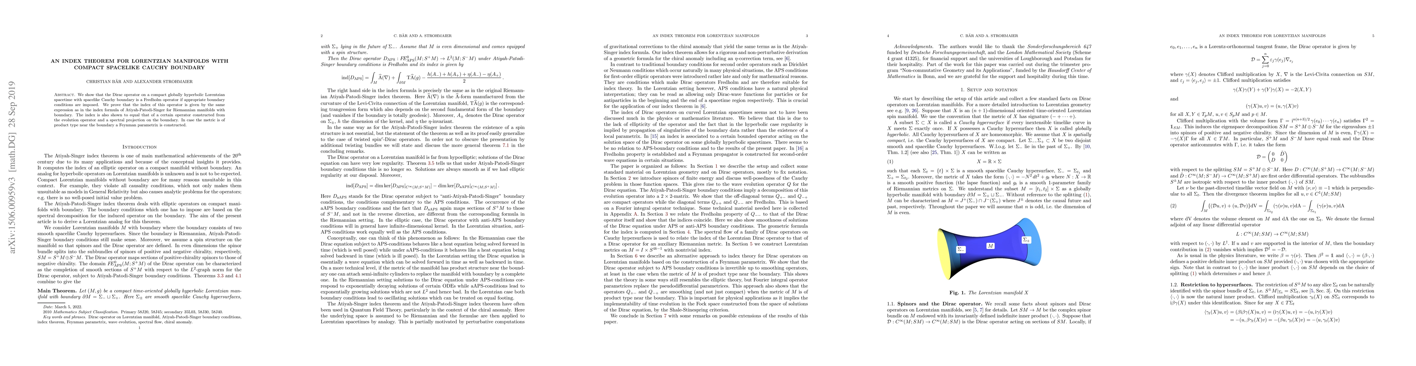 This paper establishes an index theorem for the Dirac operator on compact globally hyperbolic Lorentzian manifolds with spacelike Cauchy boundary, showing it is Fredholm under specific boundary conditions. The index matches the Atiyah-Patodi-Singer formula for Riemannian manifolds and is equivalent to an operator constructed from the evolution operator and a boundary spectral projection.