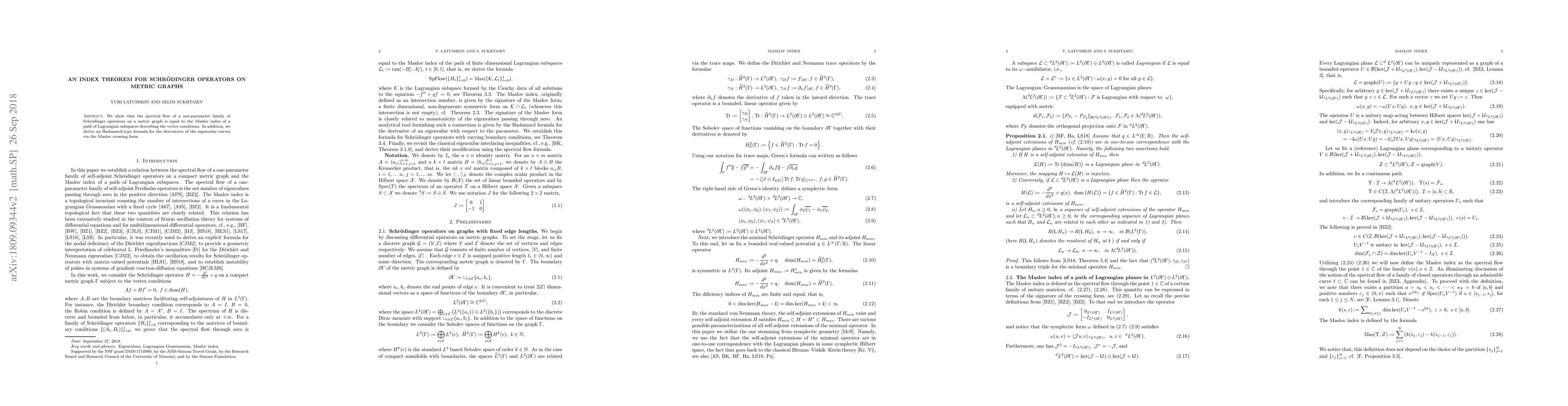 This paper establishes an index theorem relating the spectral flow of Schrödinger operators on metric graphs to the Maslov index of associated Lagrangian subspaces, and provides an Hadamard-type formula for the derivatives of the eigenvalue curves using the Maslov crossing form.