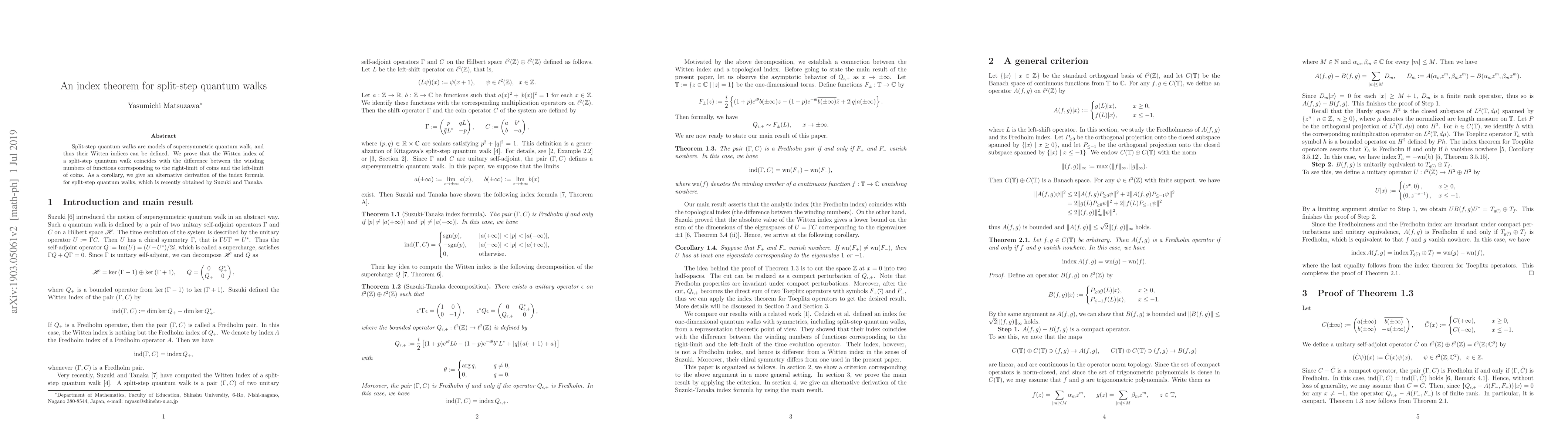 This paper establishes an index theorem for split-step quantum walks, proving that their Witten index equals the difference between the winding numbers of right-limit and left-limit coin functions, providing an alternative derivation of the index formula previously obtained by Suzuki and Tanaka.